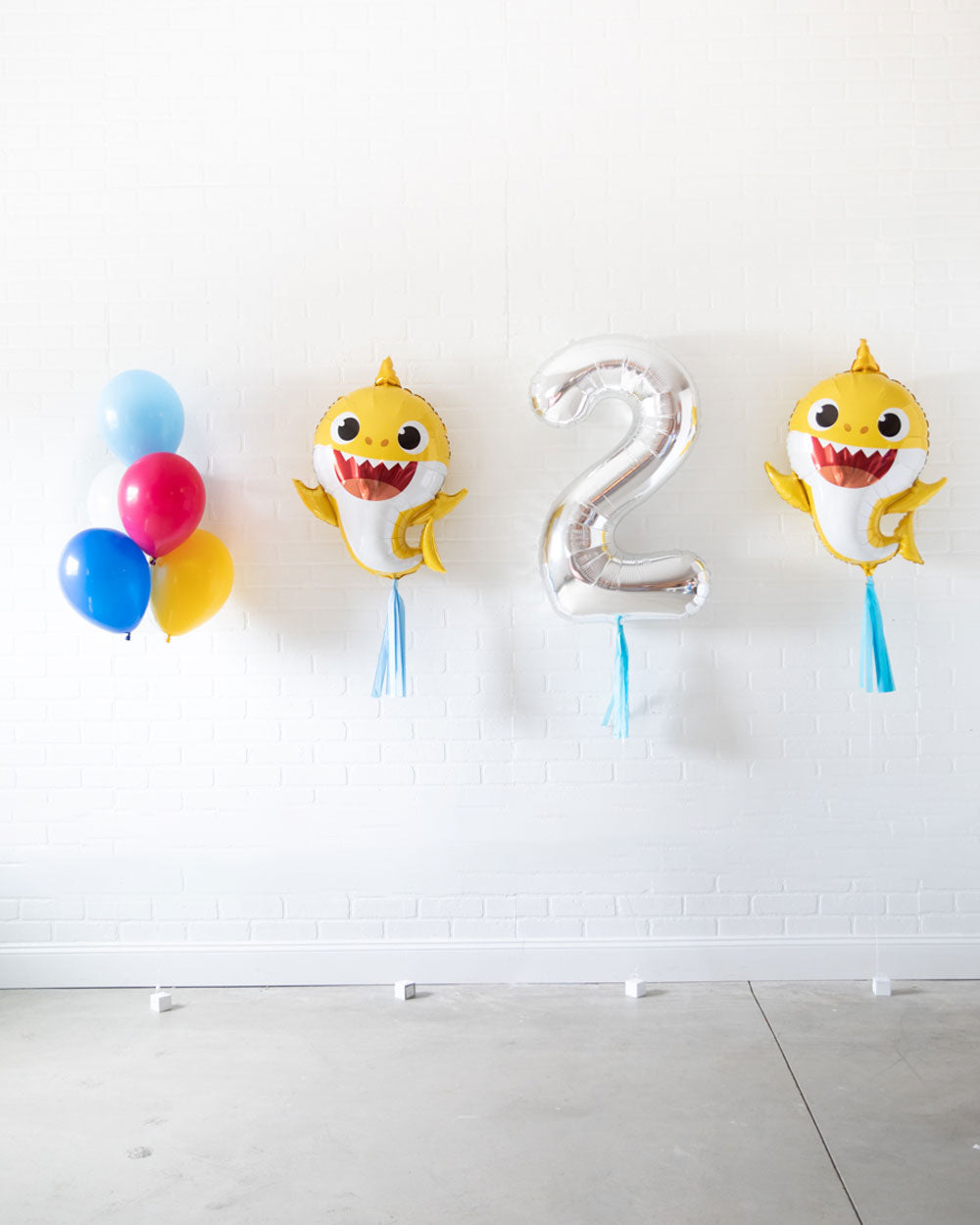 Create an extra fun birthday with this Baby Shark party set. This includes two Baby Shark balloons, bouquet of latex balloons and a silver number foil balloon. Use this around the room of any space for extra fun birthday decor.