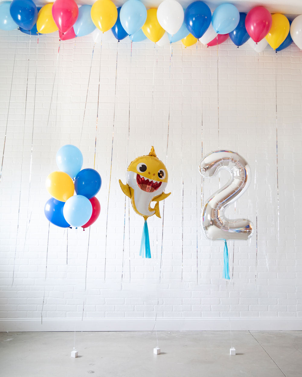 Fill the room with this super fun Baby Shark balloon set! This includes ceiling balloons, a Baby Shark balloon, number balloon and a balloon bouquet that make the perfect backdrop. Use these bright balloons for your little one's Baby Shark themed party.