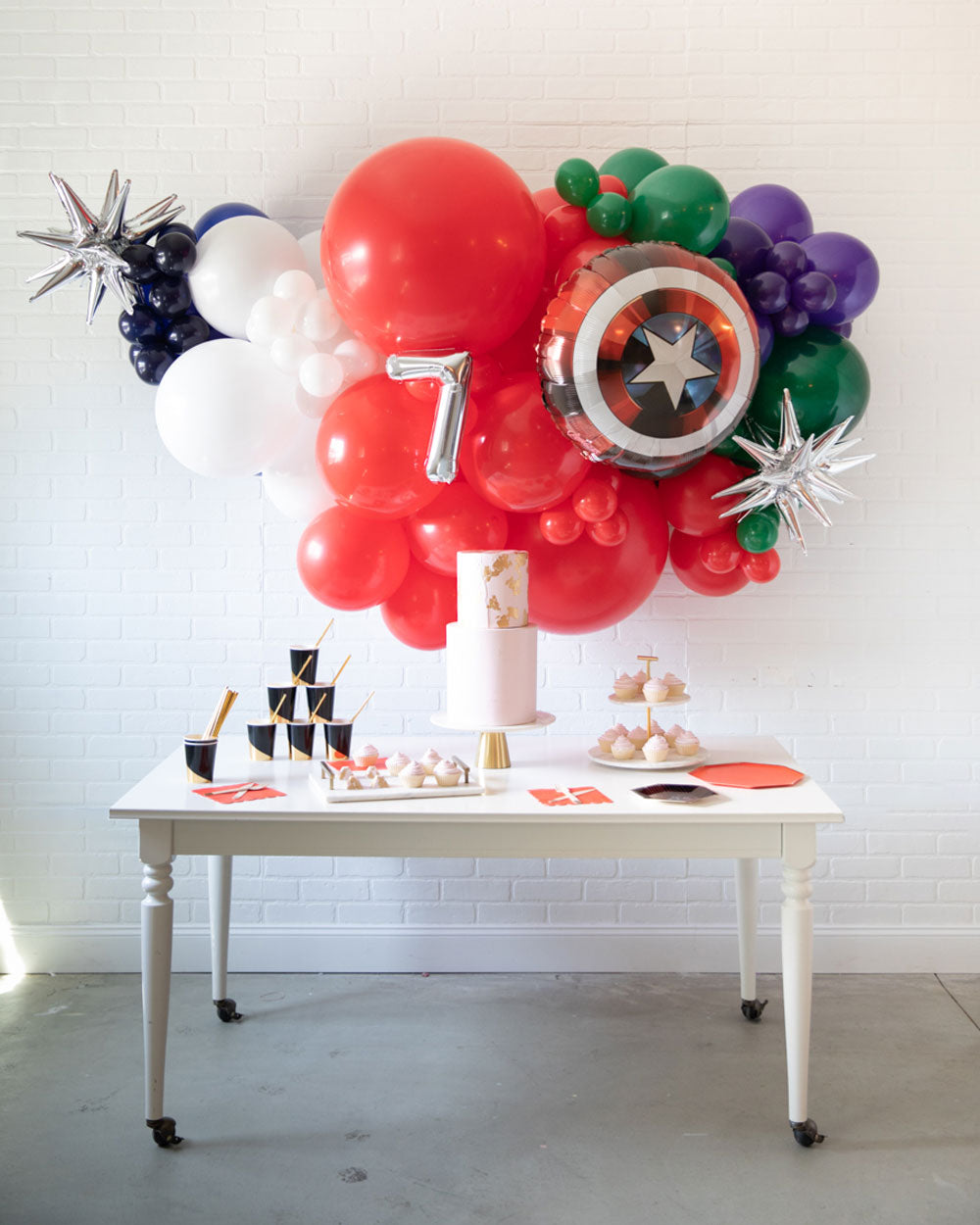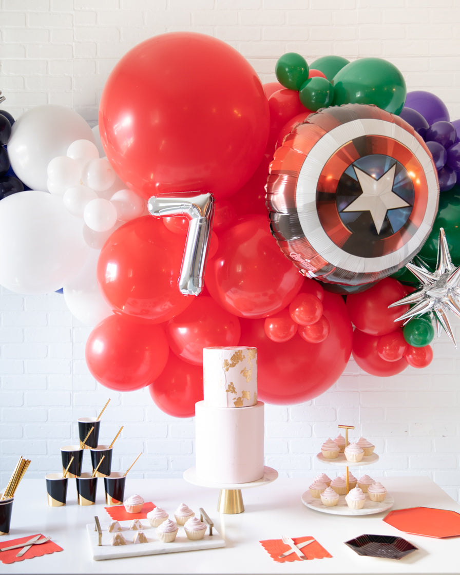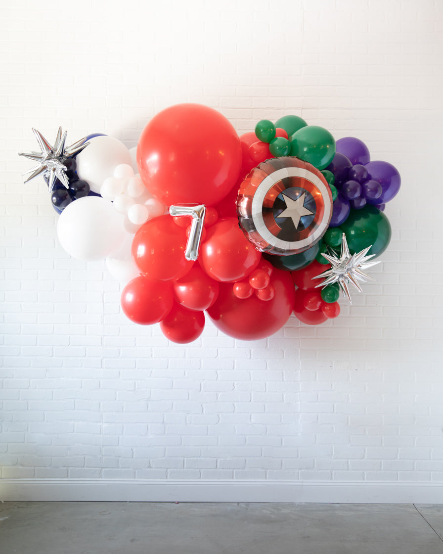 Spread some cheer with this eye-catching balloon garland. A great way to celebrate an important occasion, this air-filled 6ft balloon backdrop piece can be installed above a sweets table or on a wall for a photo op. Includes a Captain America Shield balloon and silver number foil. Complete the look with giant balloons or balloon columns from this Avengers collection.