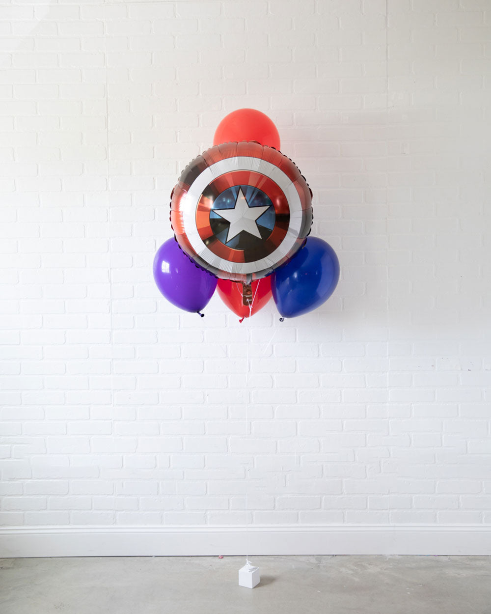 This fun bouquet with bright helium-filled balloons and a foil happy birthday Captain America Shield balloon is great for a Avengers themed kids party. Place around the room or near a sweets table and photo backdrop for extra impact. This product is Ready-To-Party™. Comes inflated and on a weight Simply unbag and enjoy!