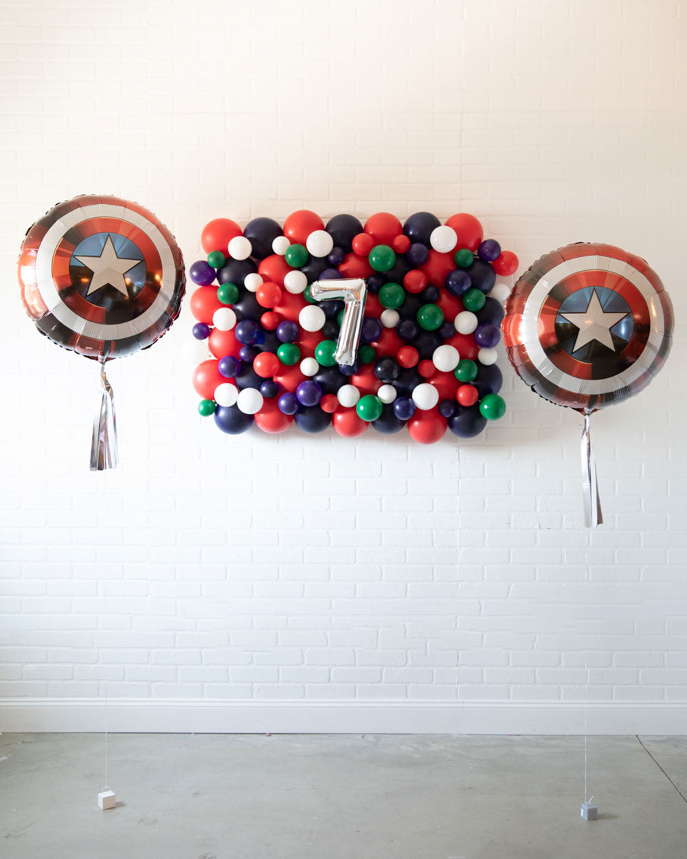 Make the ultimate birthday backdrop with this fun and festive Avengers inspired backdrop. This set includes a Captain America Shield mylar, and a colorful balloon wall to create an unforgettable Avengers themed party.