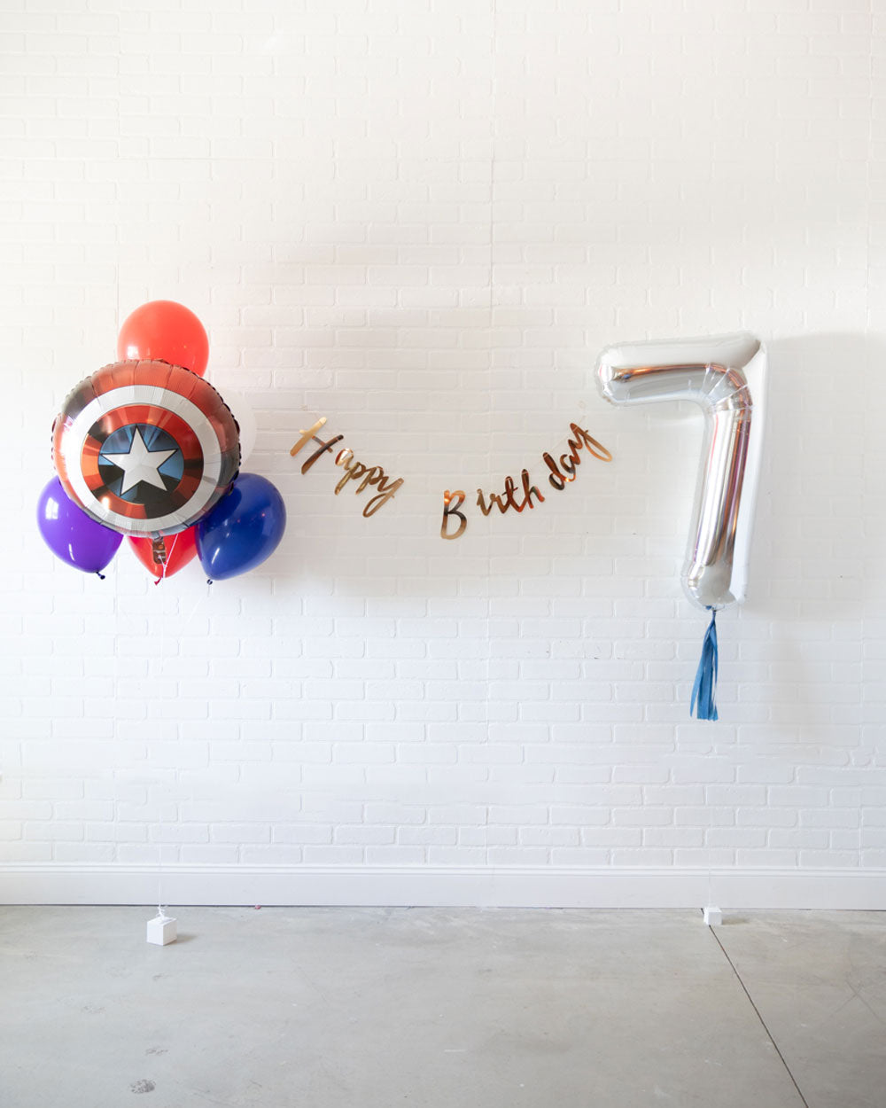 Bring your party together with this adorable and easy Avengers themed birthday package. This set includes a Captain America Shield balloon bouquet, birthday banner and a silver foil number balloon, which easily transforms any room or sweets table.