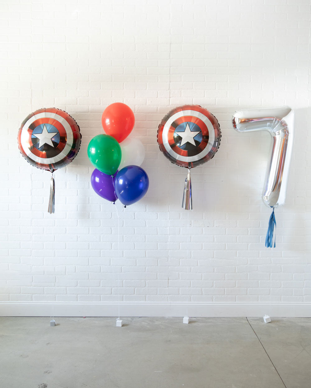 Create an extra fun birthday with this Avengers party set. This includes two Captian America Shield balloons, bouquet of latex balloons and a silver number foil balloon. Use this around the room of any space for extra fun birthday decor.