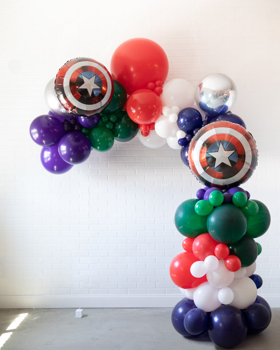 Create a statement for your kids Avengers themed birthday party with our floating arch and column set. This includes a Captain America Shield themed floating balloon arch and matching column with a Captain America Shield themed mylar balloons to make a Avengers birthday party extra fun.