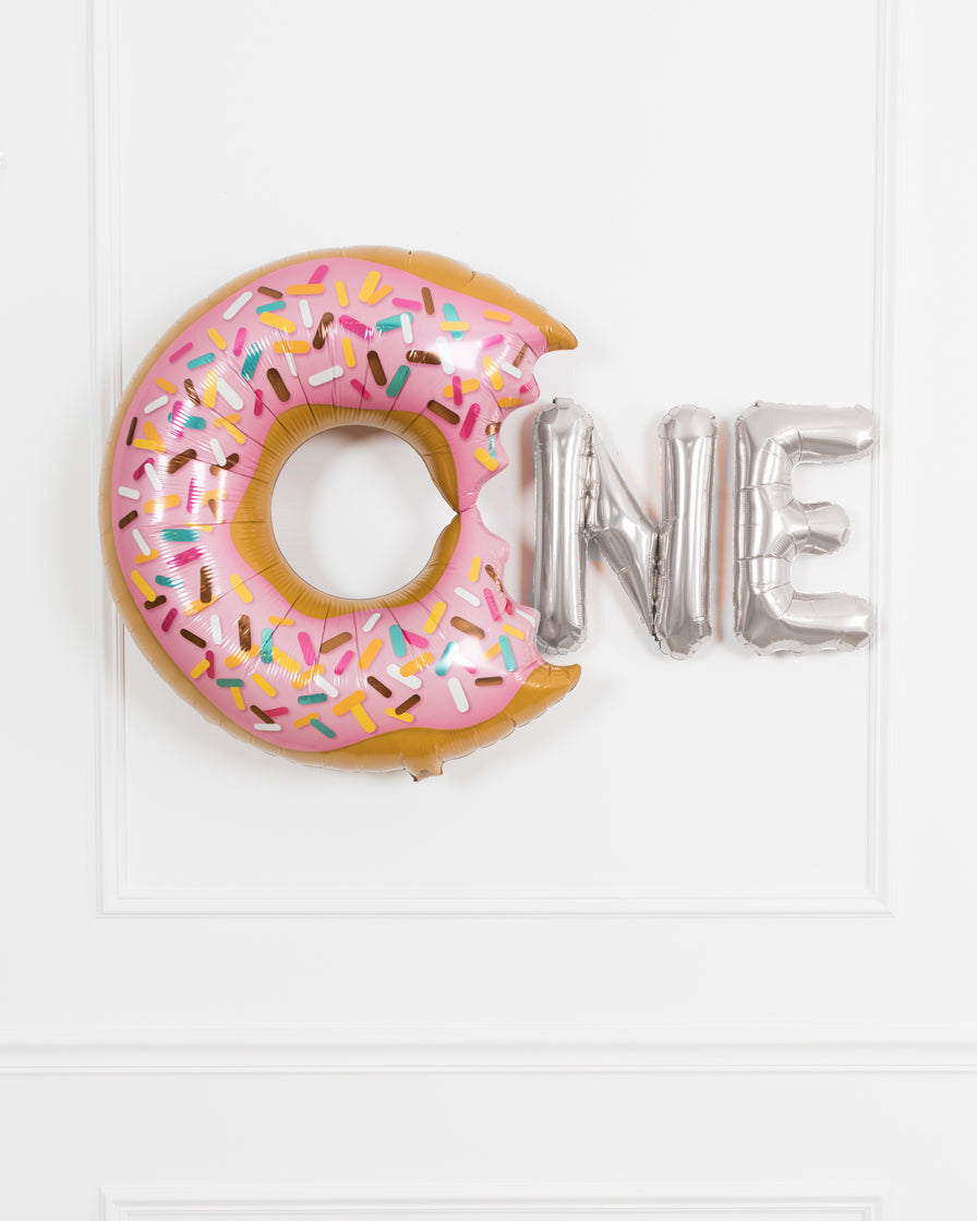 Make their first birthday extra sweet with a donut inspired balloon message. This set includes a sprinkle donut foil balloon and 16" rose gold foil letters, perfect for a backdrop or cake smash celebration.