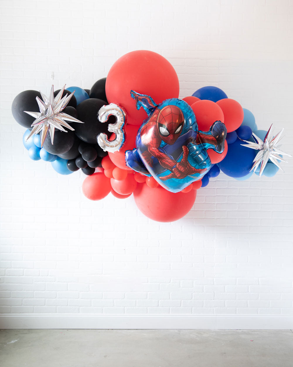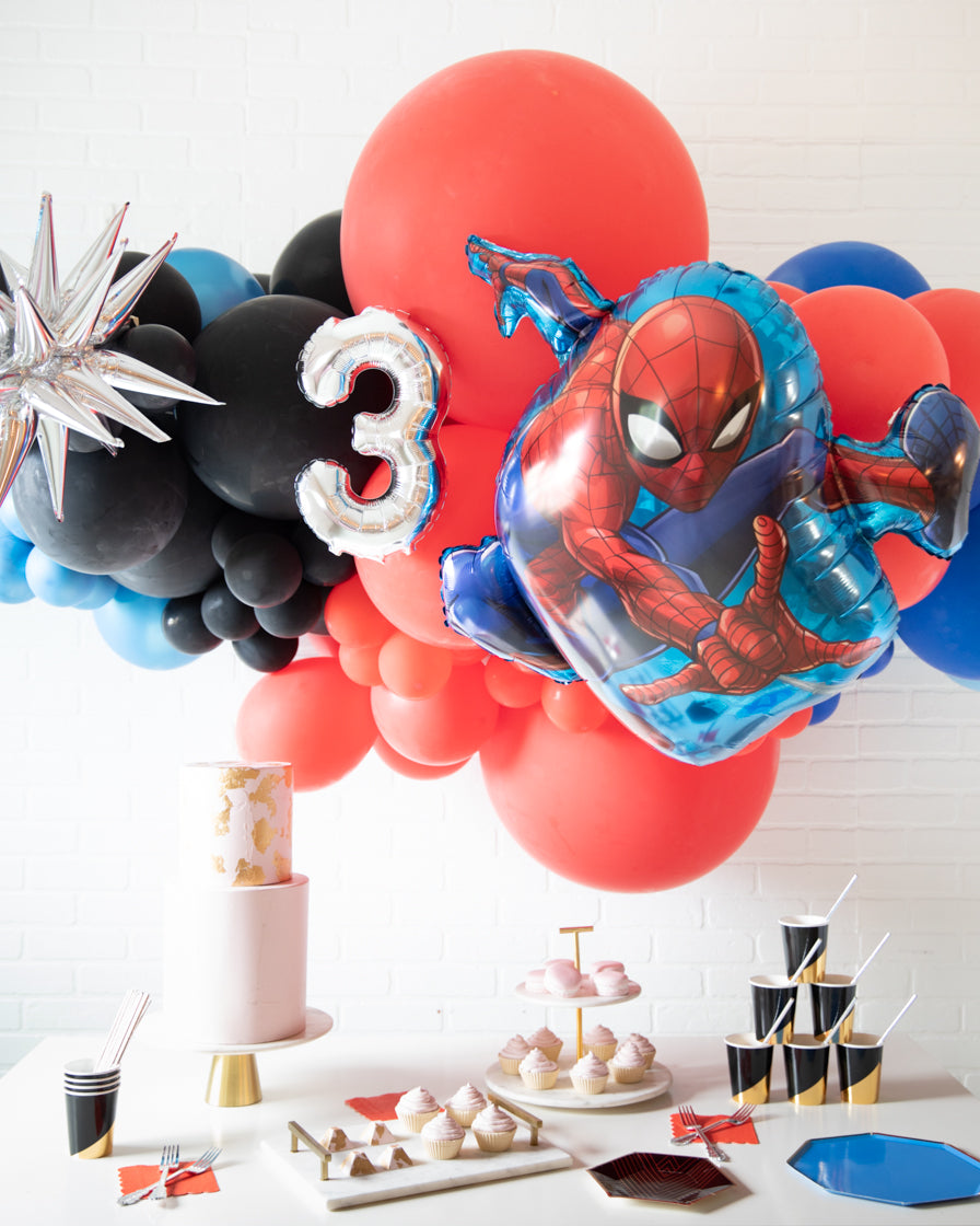 Spread some cheer with this eye-catching balloon garland. A great way to celebrate an important occasion, this air-filled 6ft balloon backdrop piece can be installed above a sweets table or on a wall for a photo op. Includes a Spiderman balloon and silver number foil.