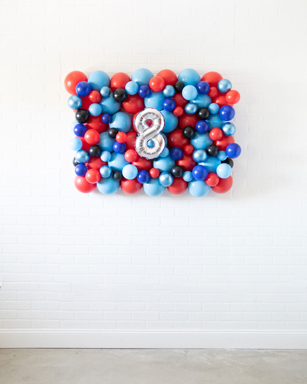 Our Spiderman themed balloon backdrop is a perfect way to celebrate a little boys birthday! This 30" by 40" balloon wall includes an air-filled silver number balloon and air filled colorful balloons designed for a Spiderman themed party. Use it behind for your sweets table decoration or a photo backdrop.