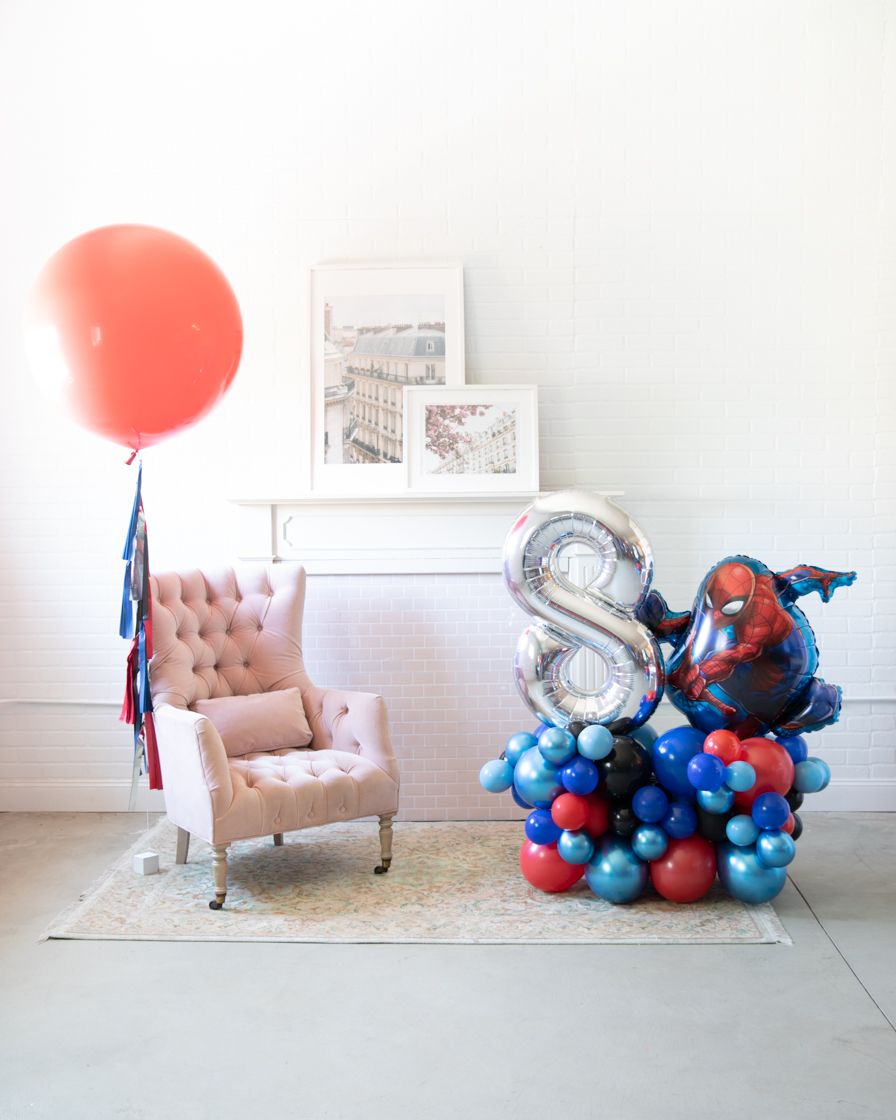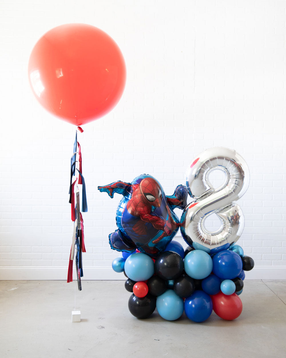 Make a bold birthday statement for a fun Spiderman themed kids birthday! Use this giant balloon with tassel garland and number pedestal to dress up any space! This design includes a silver mylar number and Spiderman mylar balloon for extra fun.