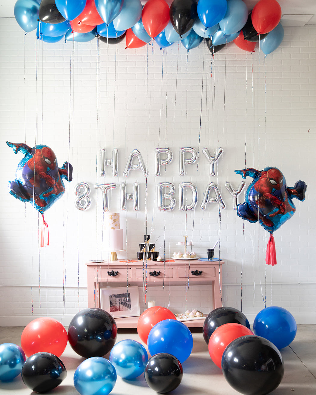 Create a Spiderman inspired party for his birthday. This set includes helium filled ceiling balloons, floor balloons, a balloon banner, and two Spiderman foil balloons to complete the look.