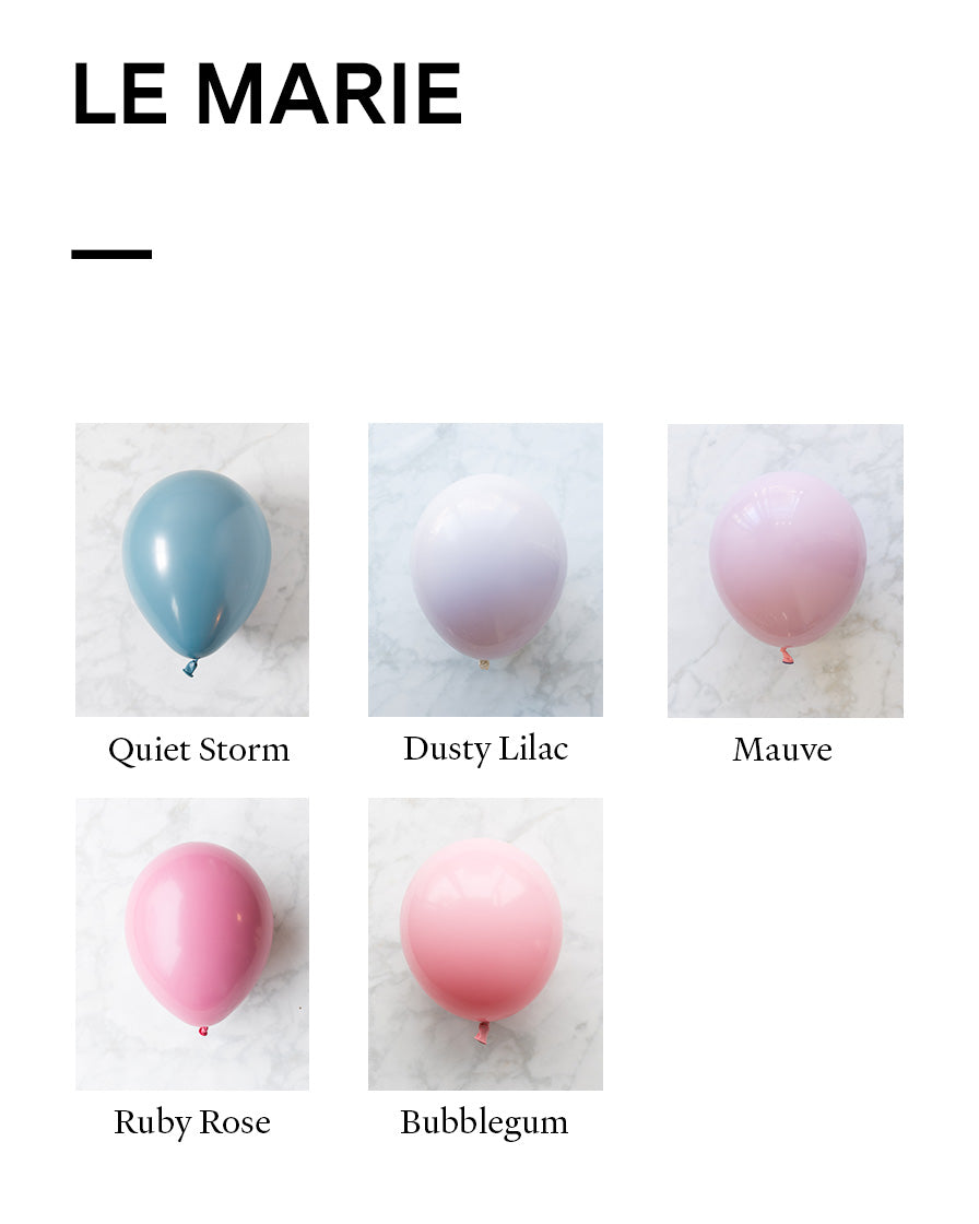 Balloon - quiet storm, dusty lilac, mauve, silk straw, ruby rose, bubblegum