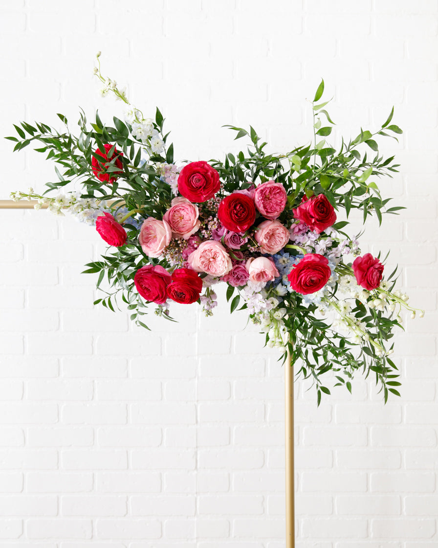 Elevate your event with this frame and floral pair. With our signature gold frame and two statement making floral arrangements, this works perfect for a Photo Backdrops, gift opening, or an entryway.