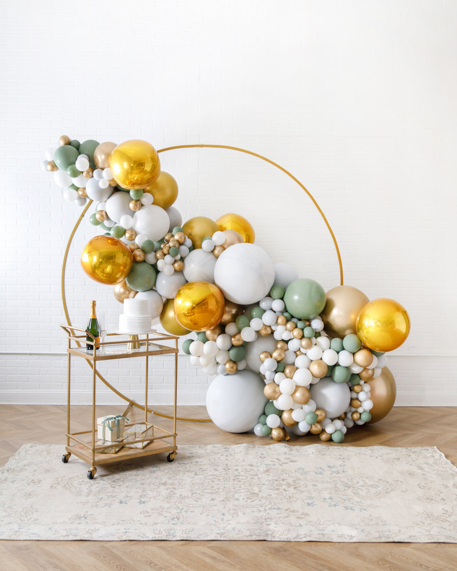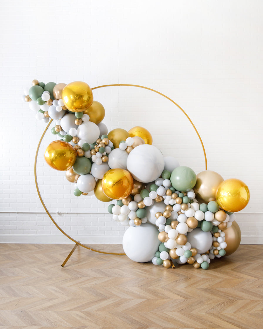 Make this a celebration you'll never forget with our signature garland on circular frame. This design creates an instant Photo Backdrop that your guests will love! With a gold frame this stand alone design can be used in any space with ease.
