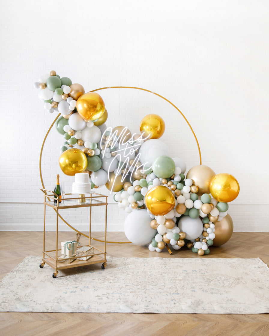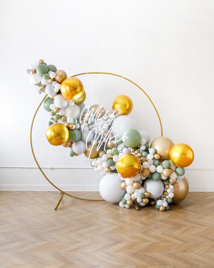 Light up your event with the ultimate backdrop! This balloon garland design includes balloons along a circular frame, as well as a beautiful Miss to Mrs neon sign to highlight your occasion in style! This works perfectly in any space and will wow your guests!