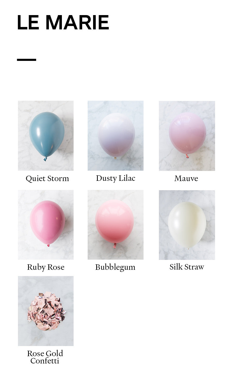 Balloon - quiet storm, dusty lilac, mauve, silk straw, ruby rose, bubblegum