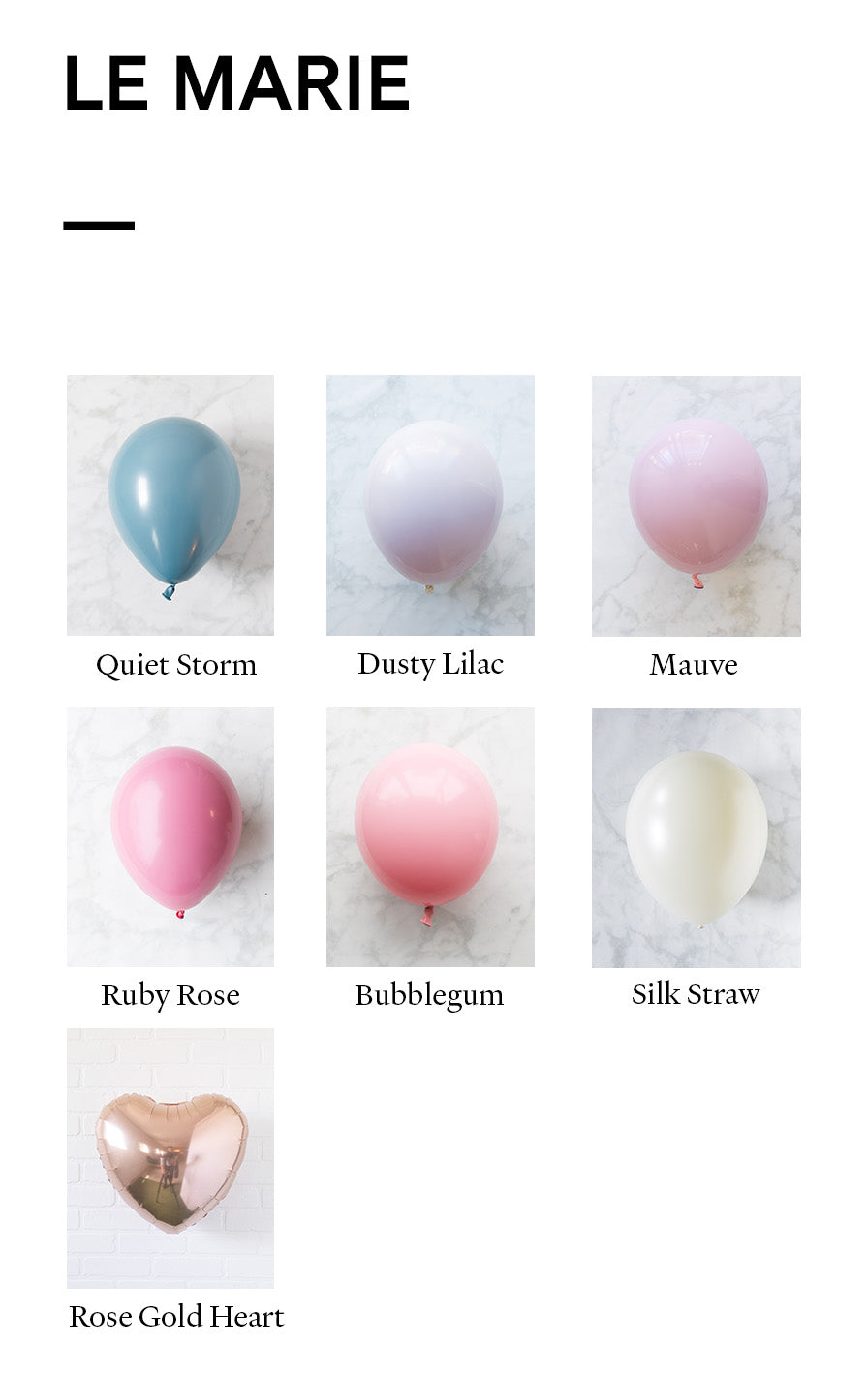 Balloon- quiet storm, dusty lilac, mauve, silk straw, ruby rose, bubblegum