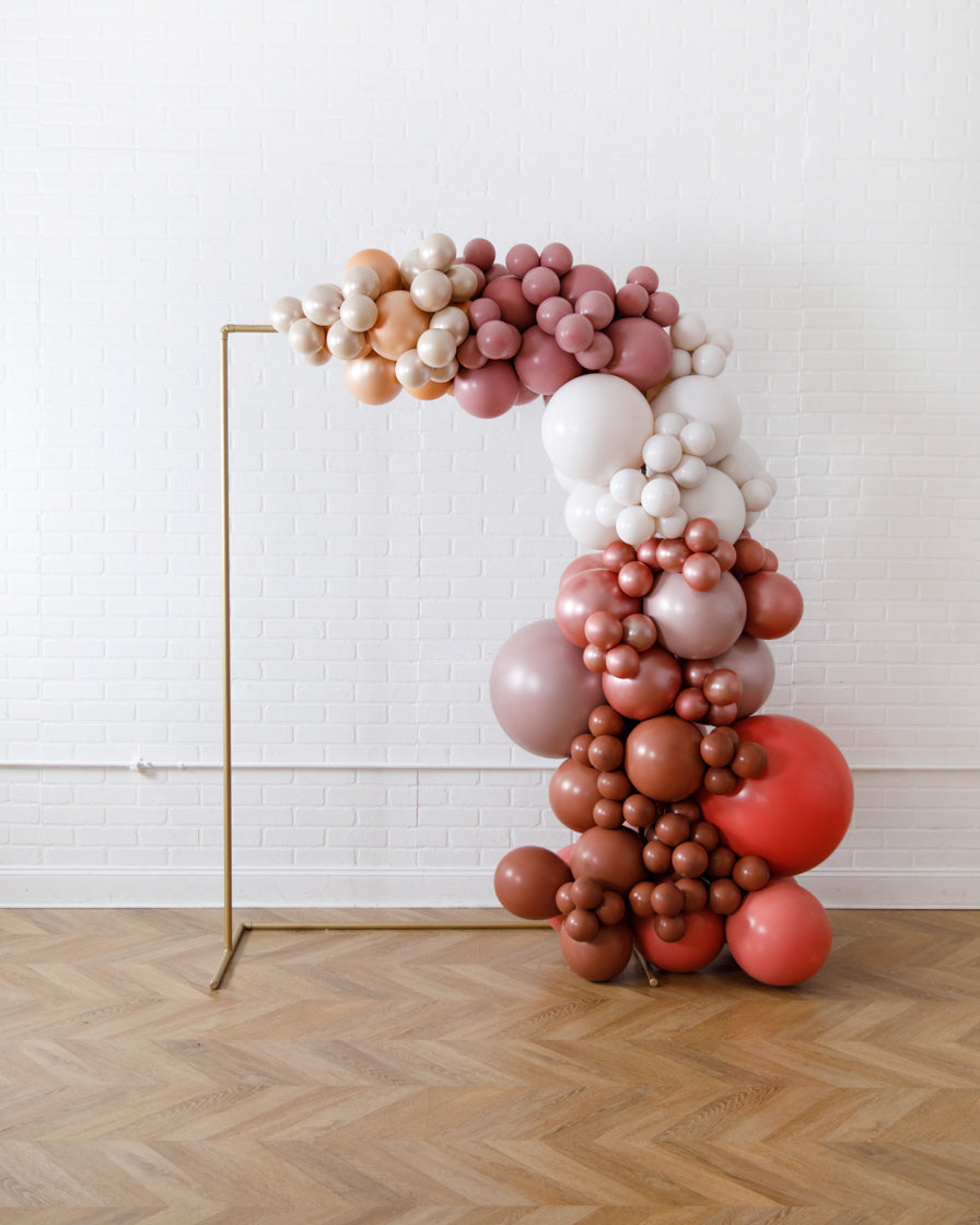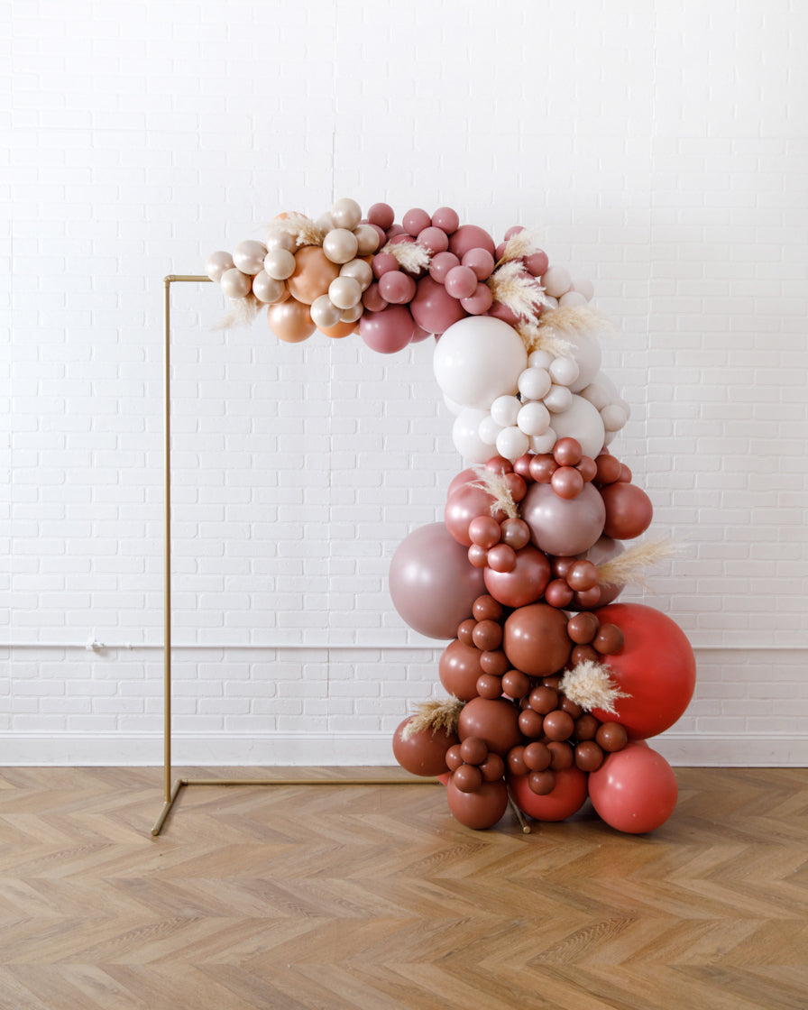 Instantly transform your event with our small frame and balloon garland design! This organic garland drapes around our signature gold frame for a one of a kind look! Bring even more glam to the look with pampas grass.