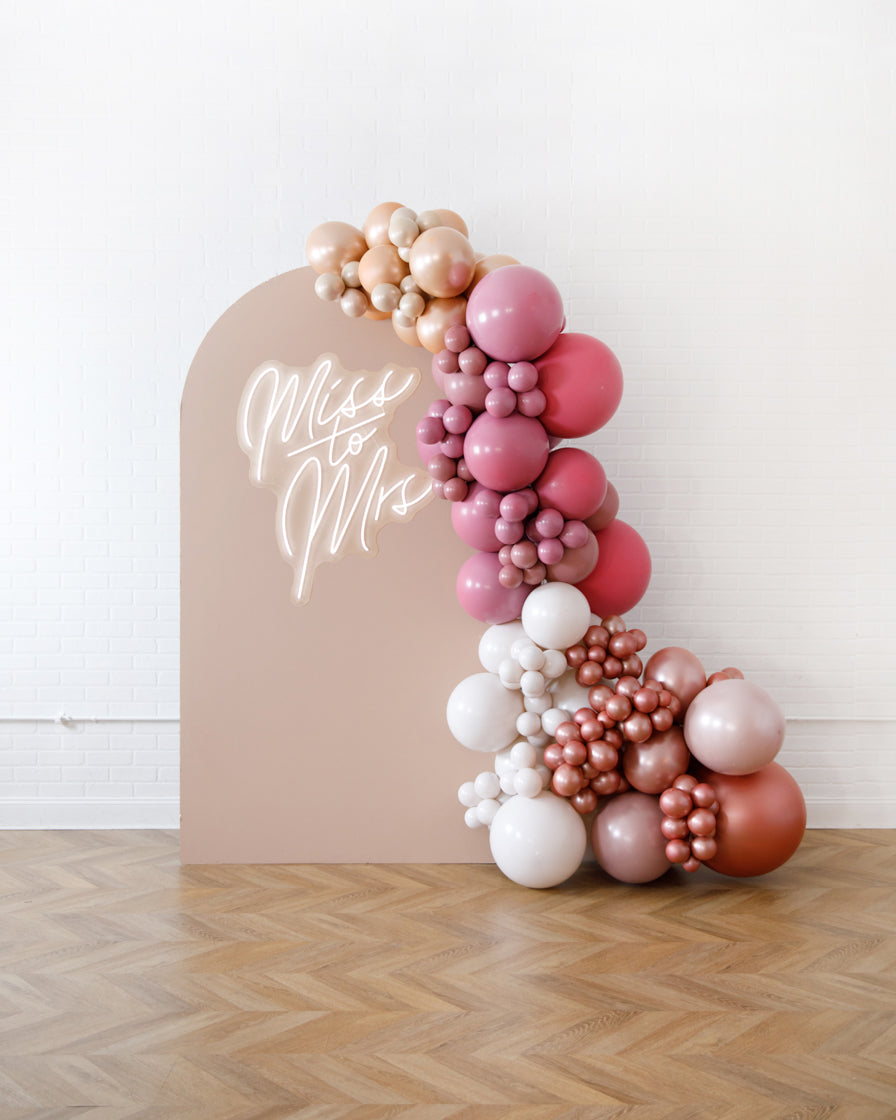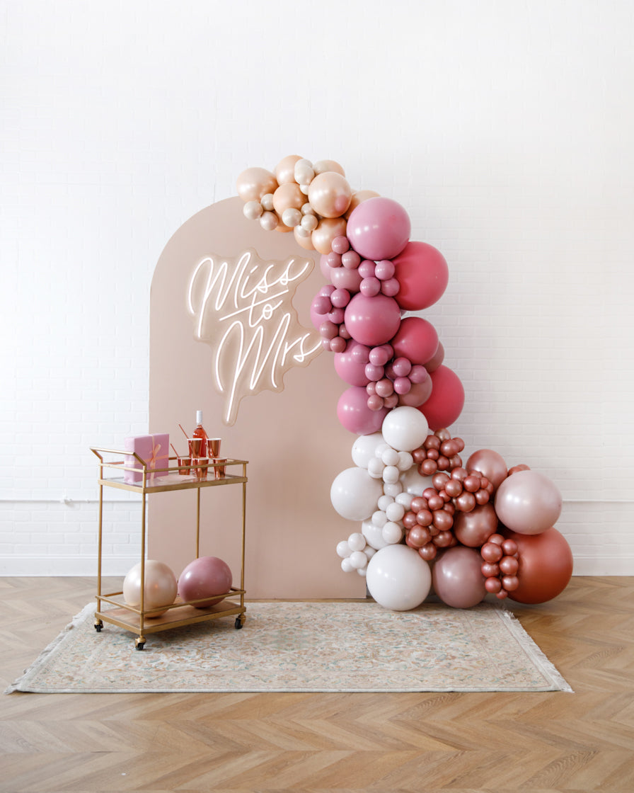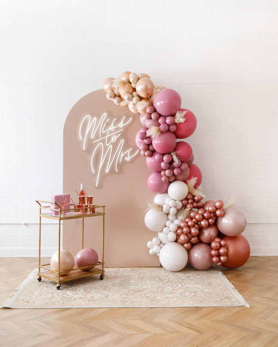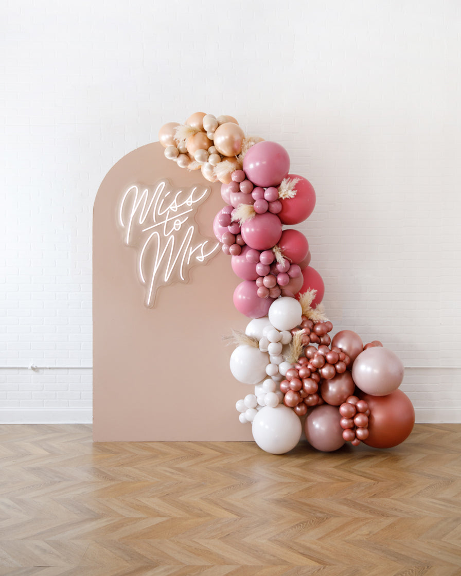 Stand out in style with this panel and balloon garland design. This includes a 7ft panel backdrop, Miss to Mrs. neon sign and accompanying organic balloon garland to match. Add pampas grass to make your photo backdrop stand out even more!
