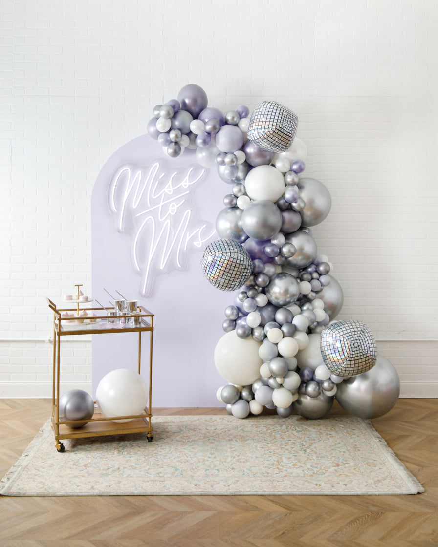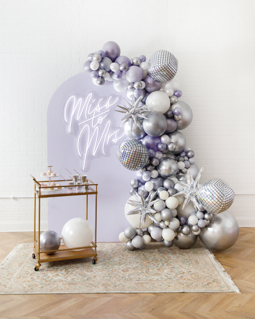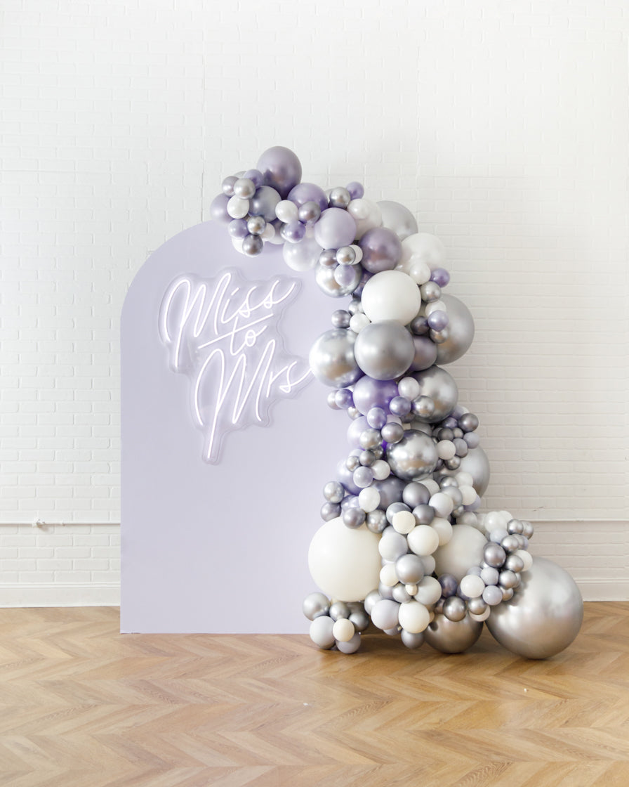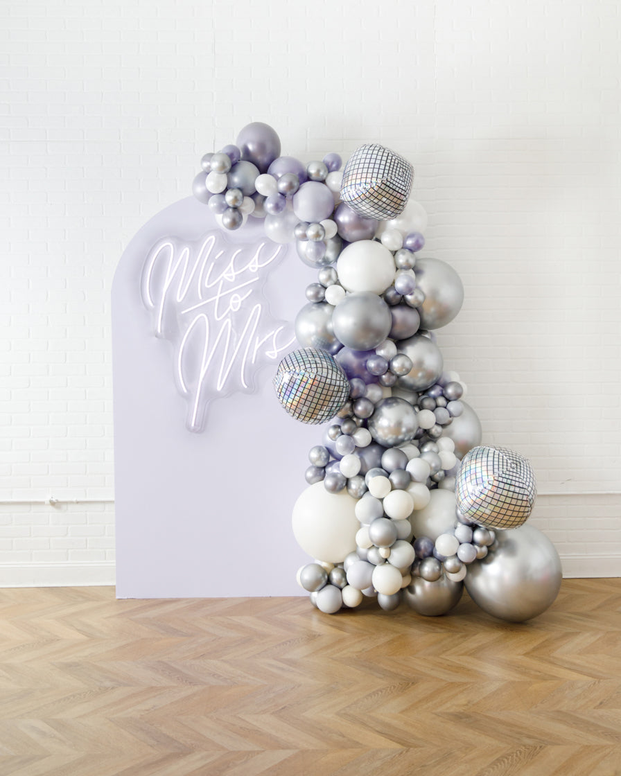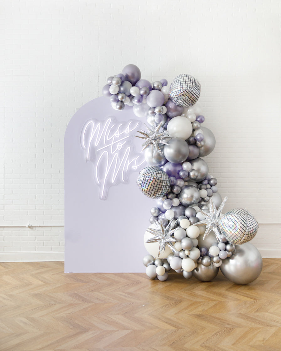 Stand out in style with this panel and balloon garland design. This includes a 7ft panel backdrop, Miss to Mrs. neon sign and accompanying organic balloon garland to match. Add foil accents to make your photo backdrop stand out even more!