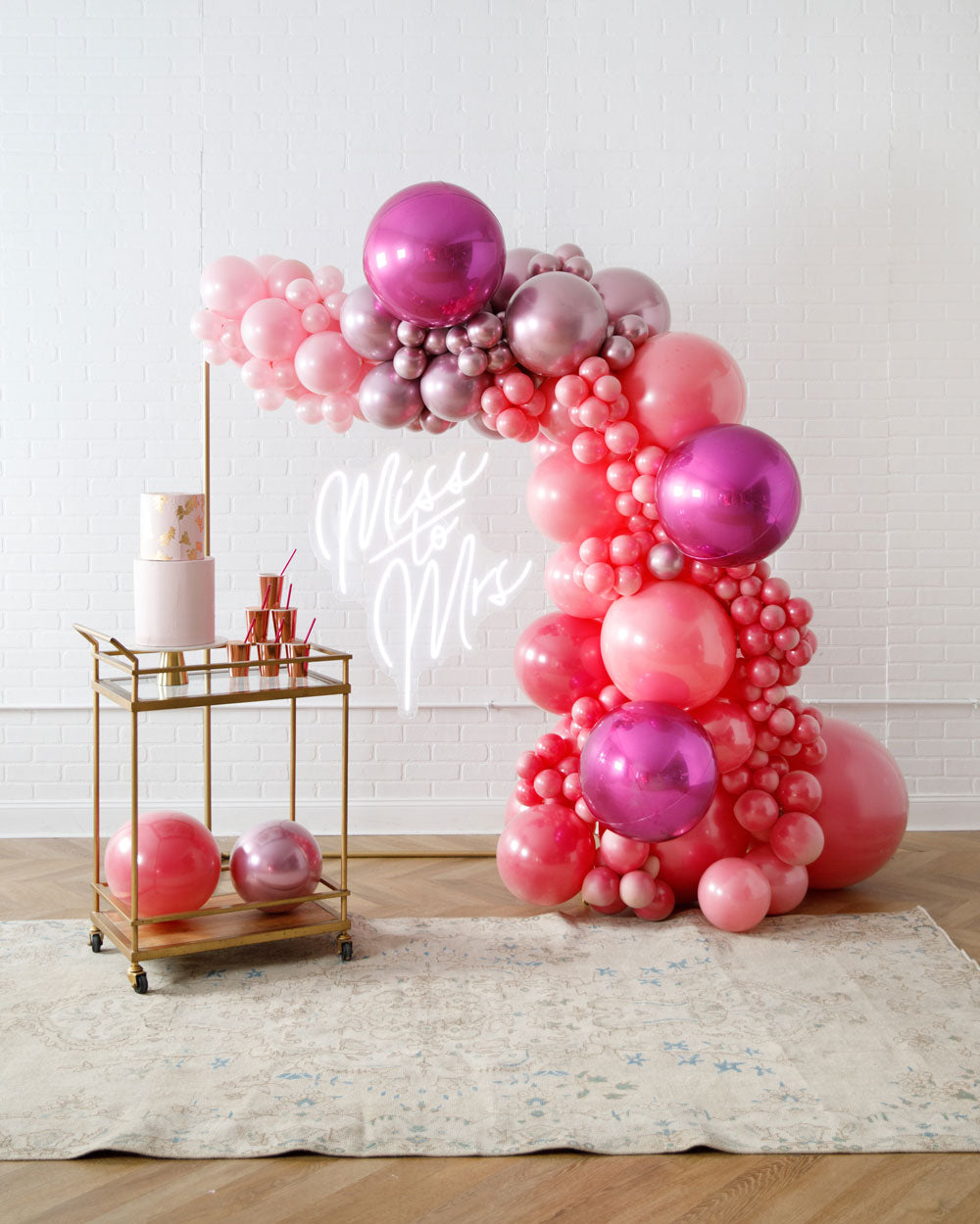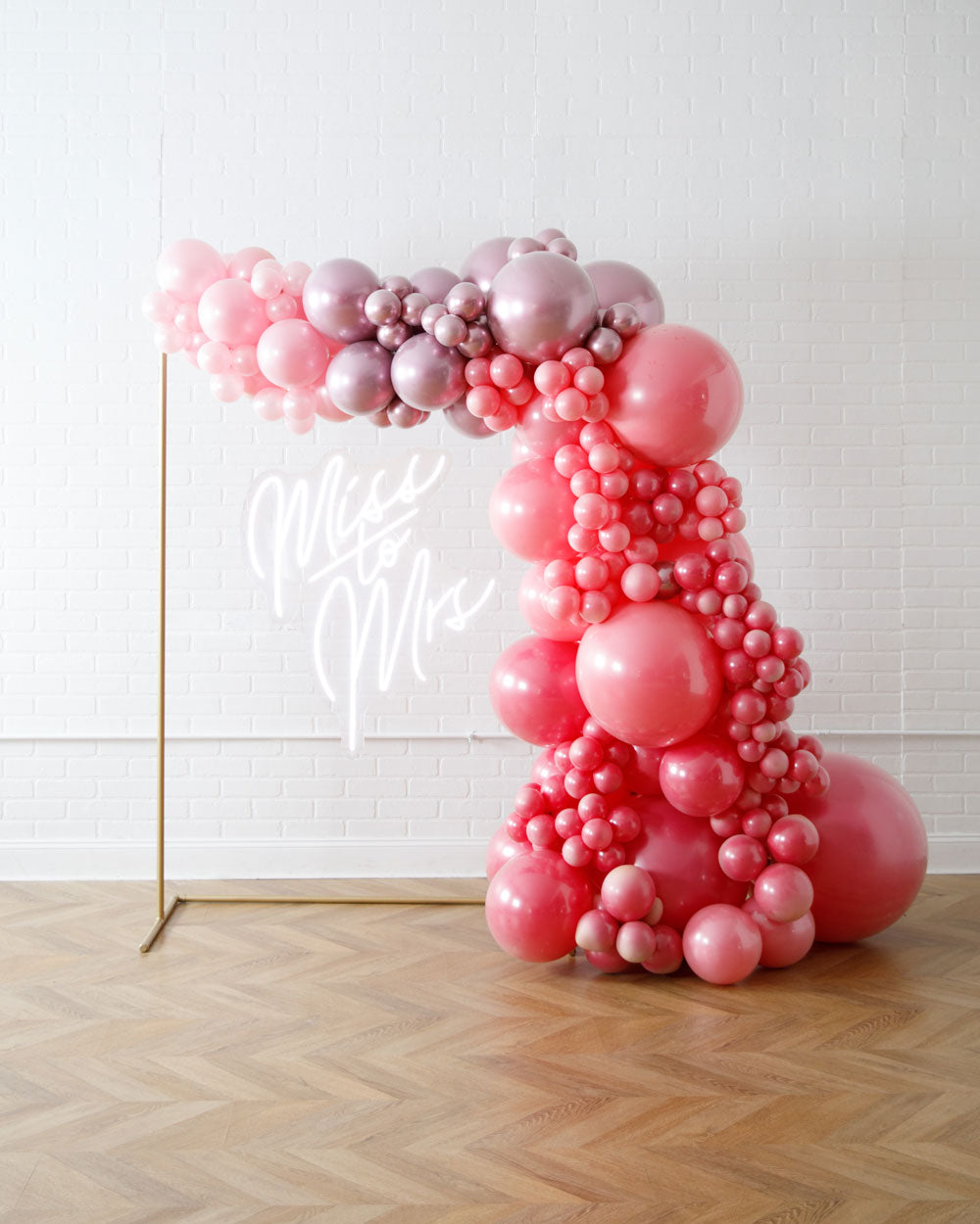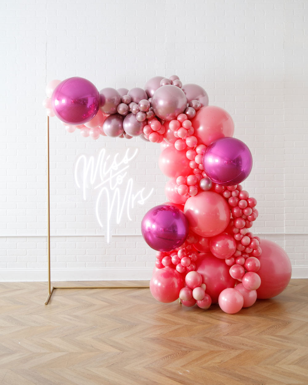 Light up your event with this neon sign, frame and balloon garland set! This picture perfect backdrop includes our neon sign, and an overflowing balloon garland draped around our small gold frame that creates a beautiful backdrop.