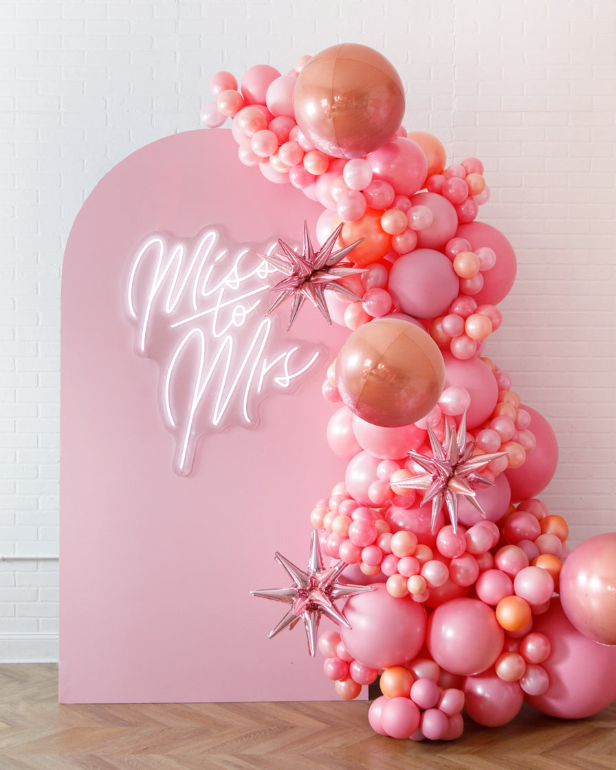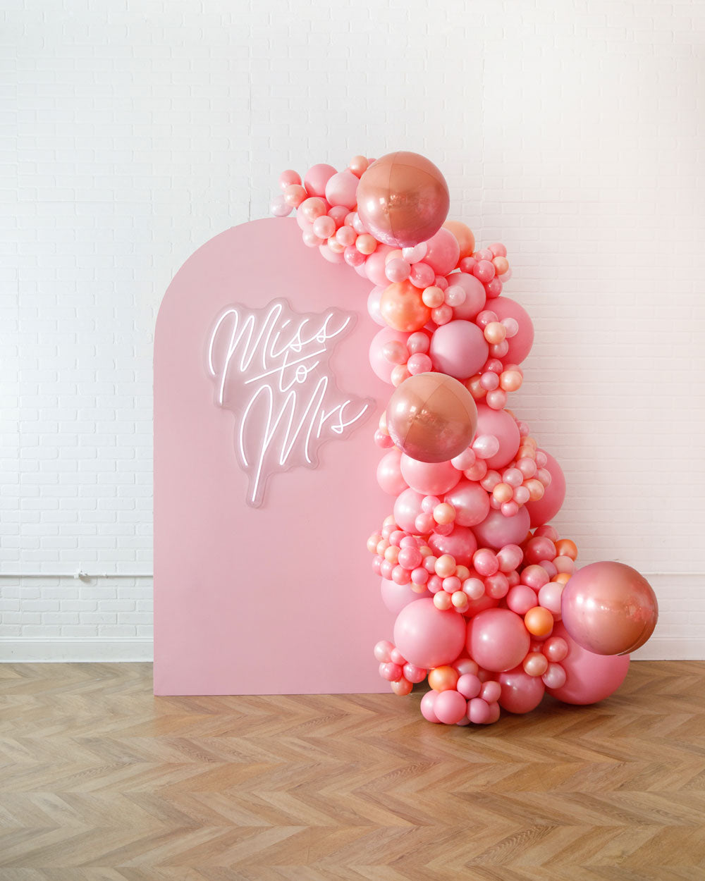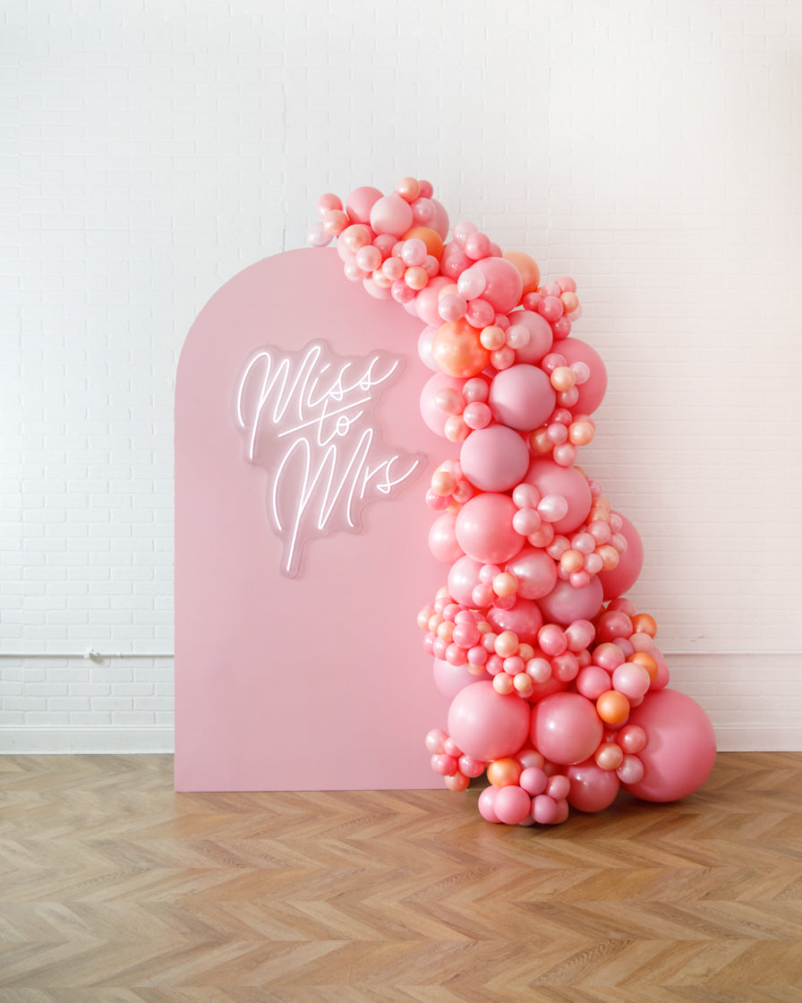 Stand out in style with this panel and balloon garland design. This includes a 7ft panel backdrop, Miss to Mrs. neon sign and accompanying organic balloon garland to match. Add foil accents to make your photo backdrop stand out even more!