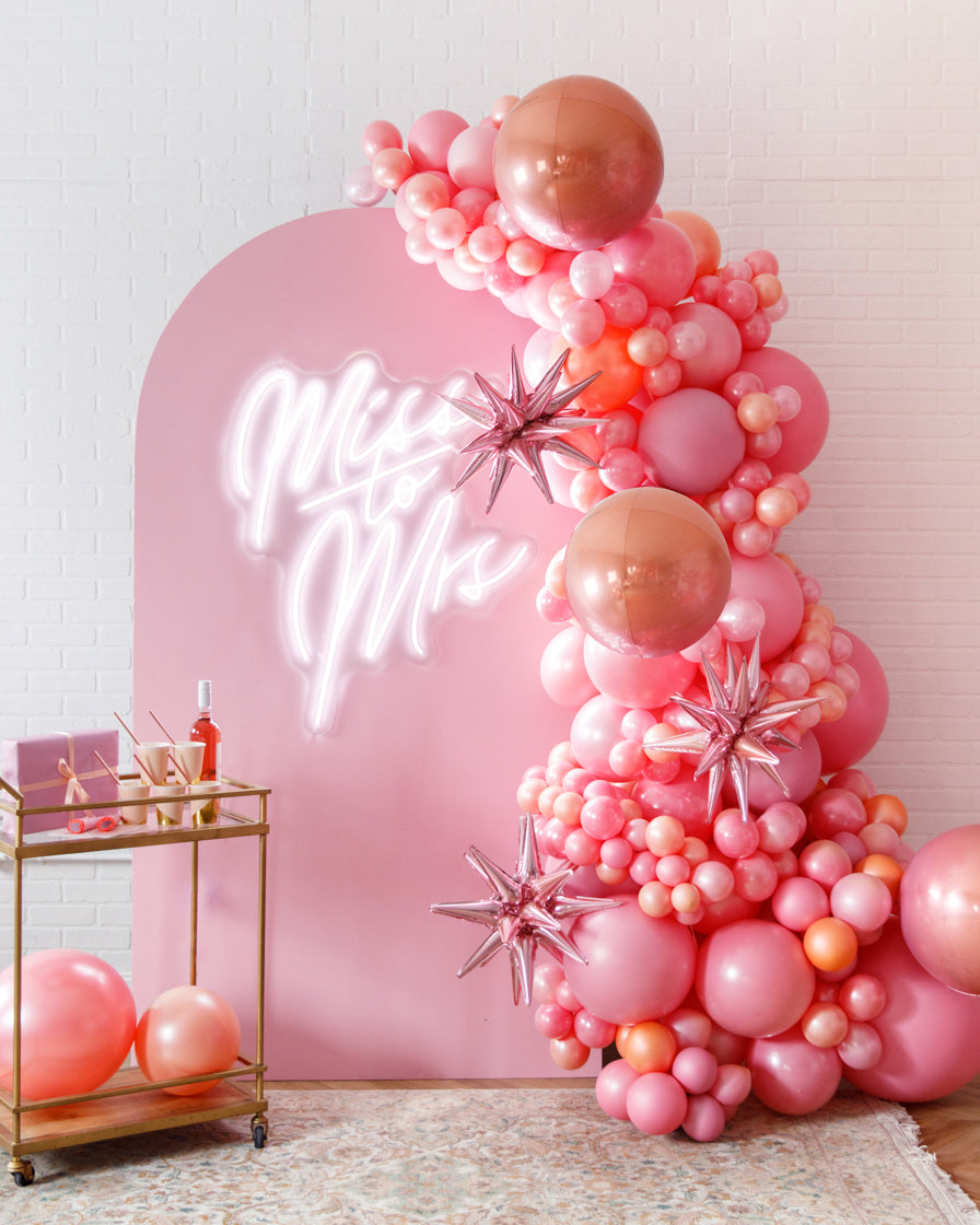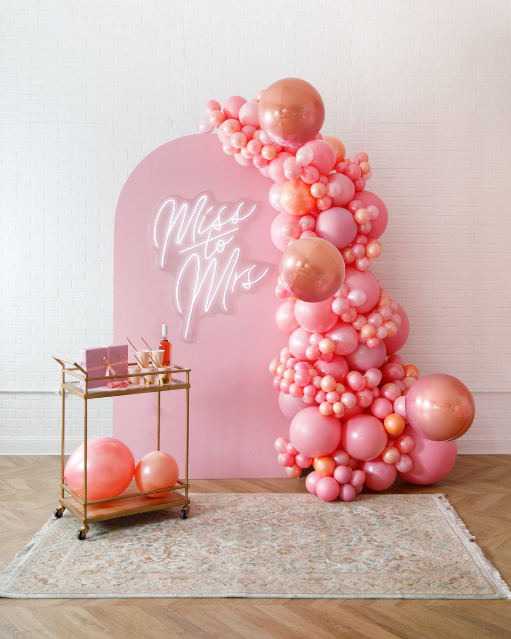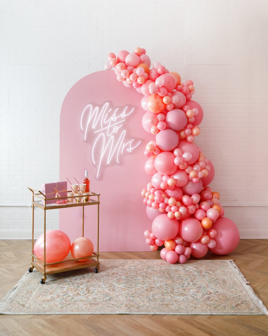 Stand out in style with this panel and balloon garland design. This includes a 7ft panel backdrop, Miss to Mrs. neon sign and accompanying organic balloon garland to match. Add foil accents to make your photo backdrop stand out even more!