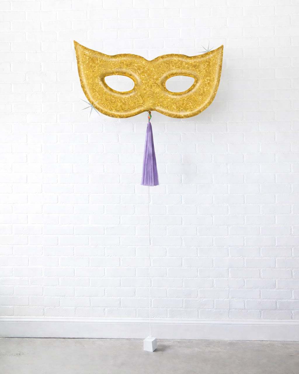 A mask-shaped foil balloon designed to bring instant Mardi Gras energy to any celebration. Finished with a purple tassel detail and paired with ribbon and a weight, this piece arrives fully assembled and ready to place, no installation or attaching required.