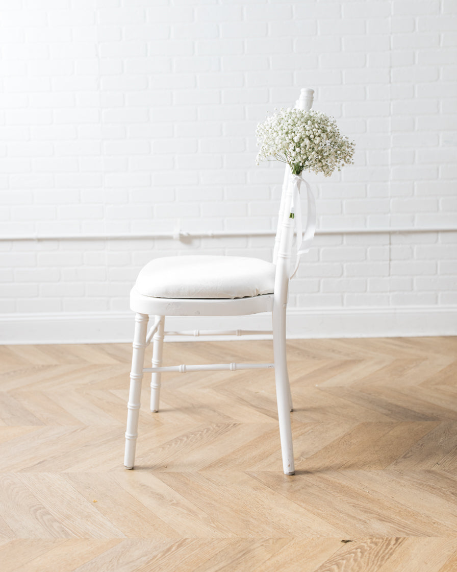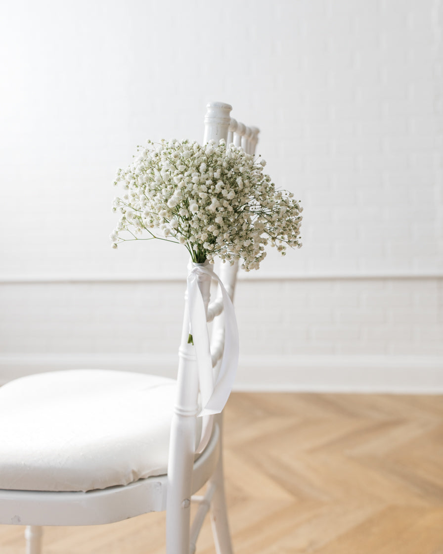 The perfect adornment for the bride, groom's, bridal party or ceremony chairs. Designed with delicate baby's breath, this floral piece adds a touch of minimal elegance, making your chairs stand out in style.