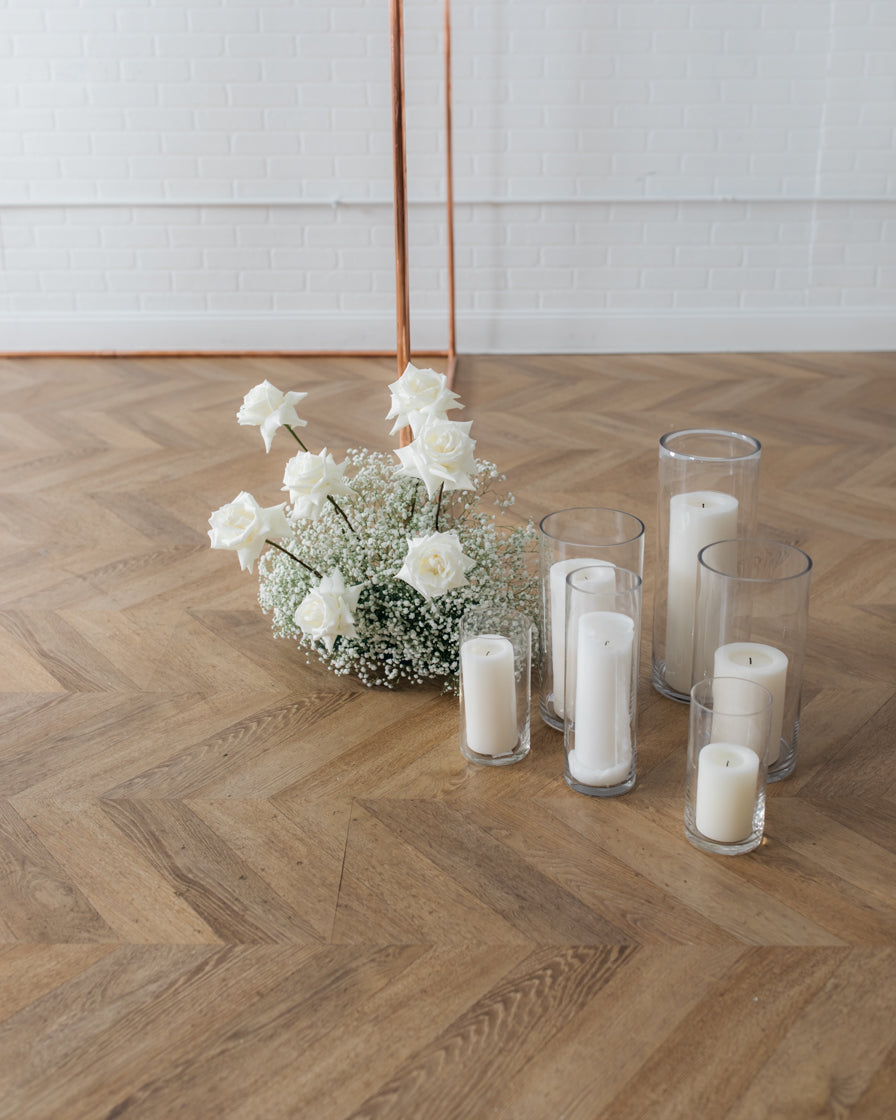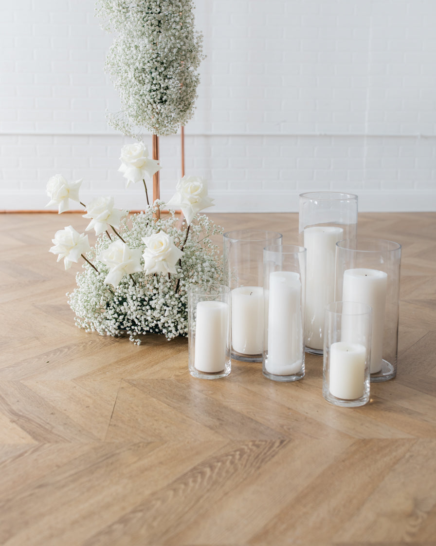 Color Palette - white candles, clear vase