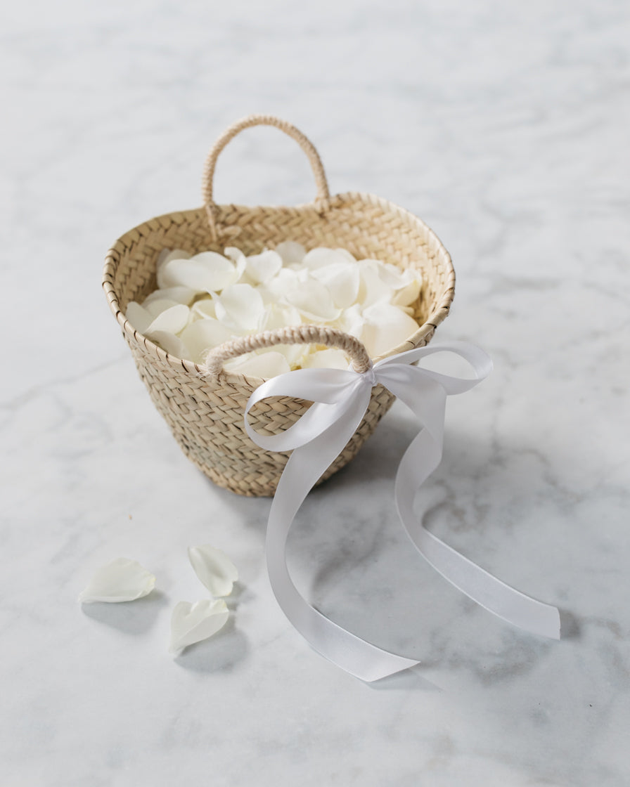 Just as adorable as the flower girl herself, this basket is complete with ribbon and soft shades of rose petals that she'll love as she walks down the aisle. Choose from our options: a basket with rose petals or white rose petals alone, both exquisite details for your special day.
