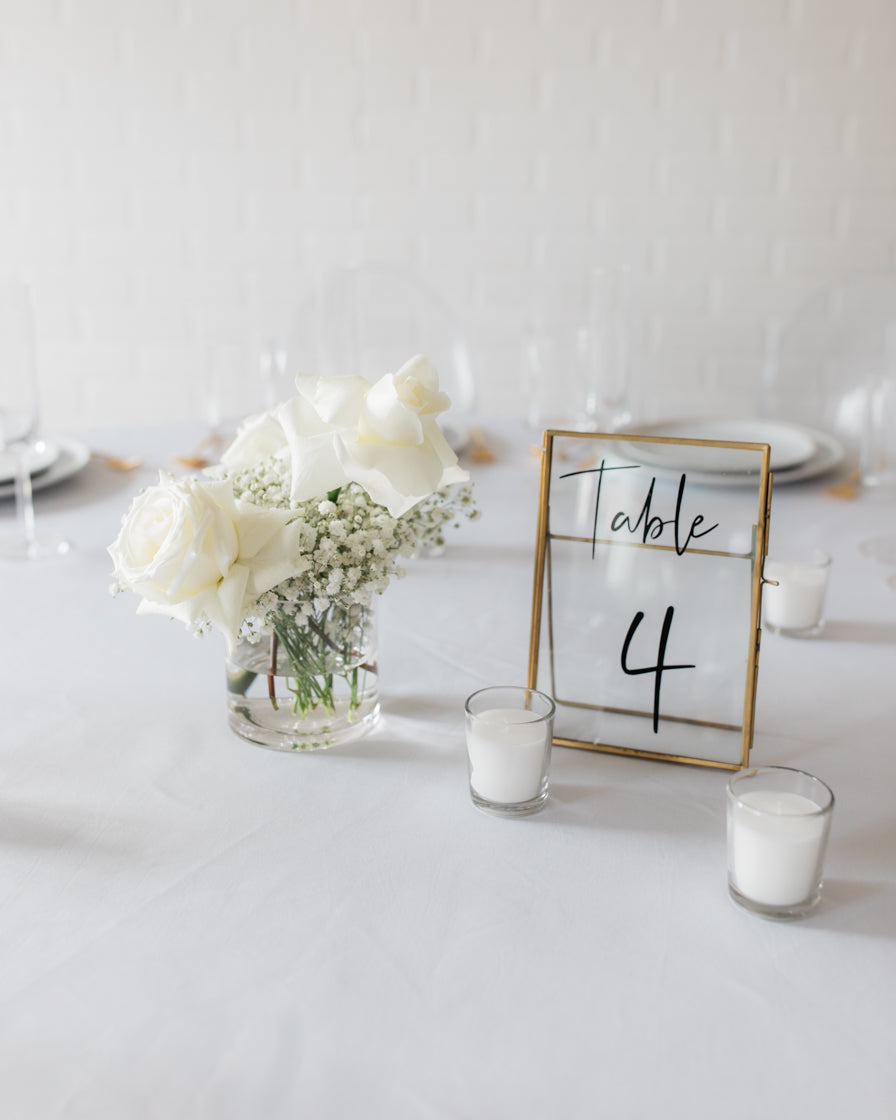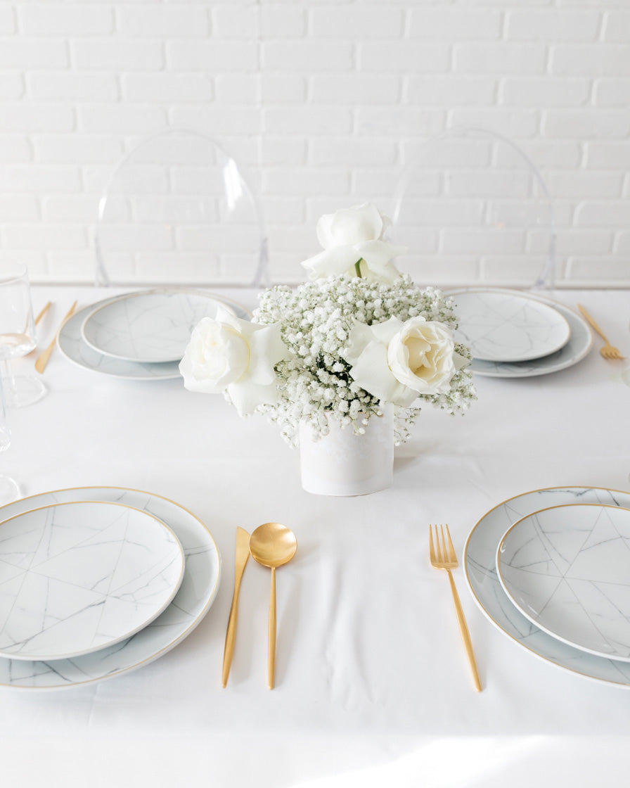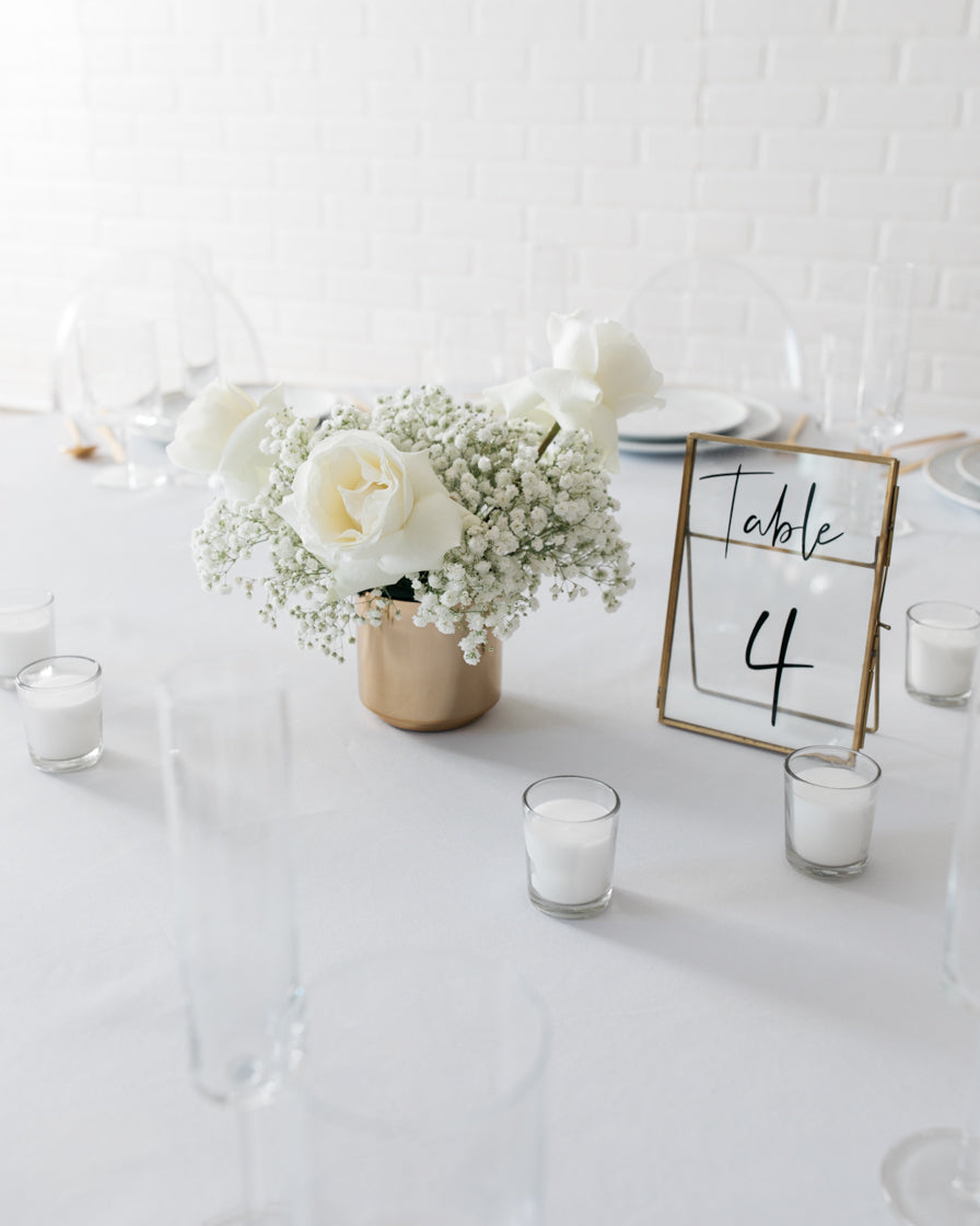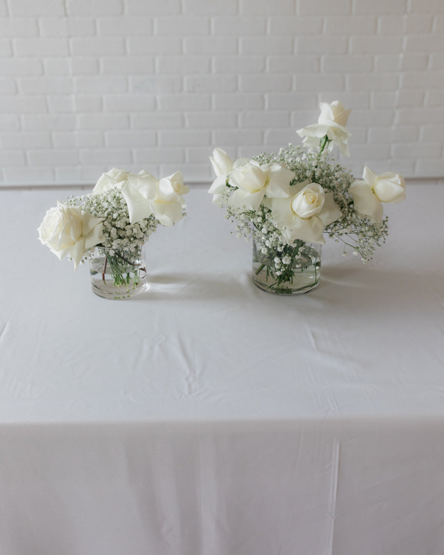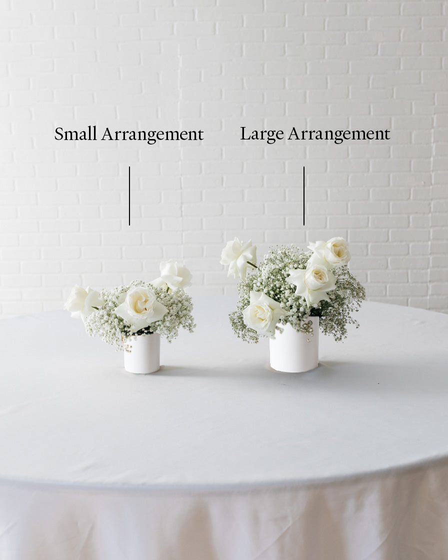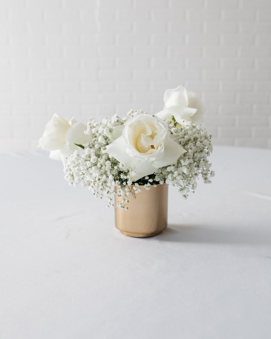 Our minimal small floral arrangement is the ultimate floral arrangement your celebration must have! This gorgeous arrangement includes white roses and white baby's breath and is the perfect arrangement for any table centerpiece. Choose between glass, gold or white vases to match your theme.