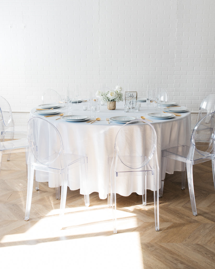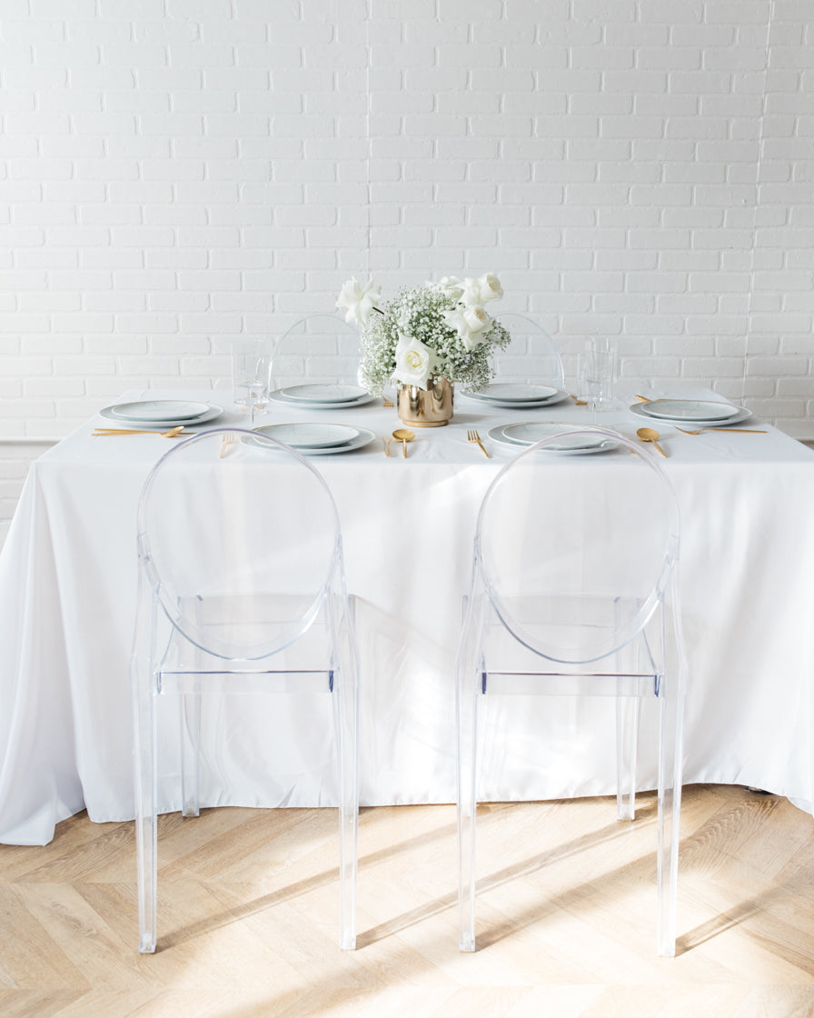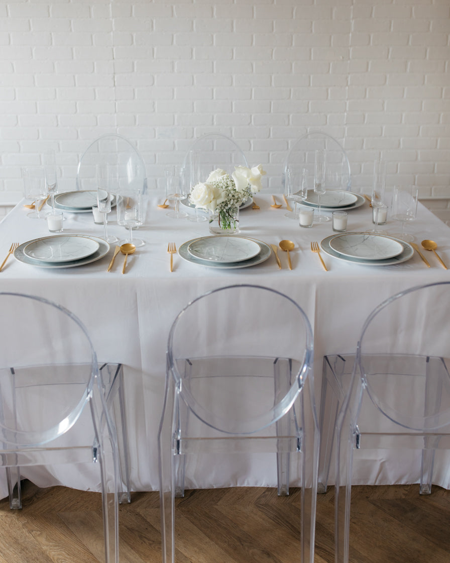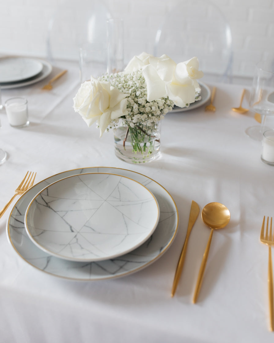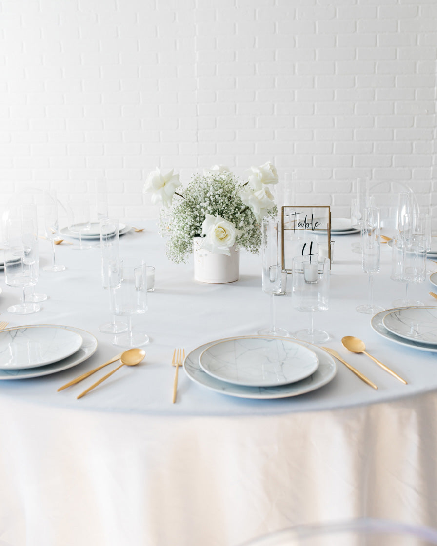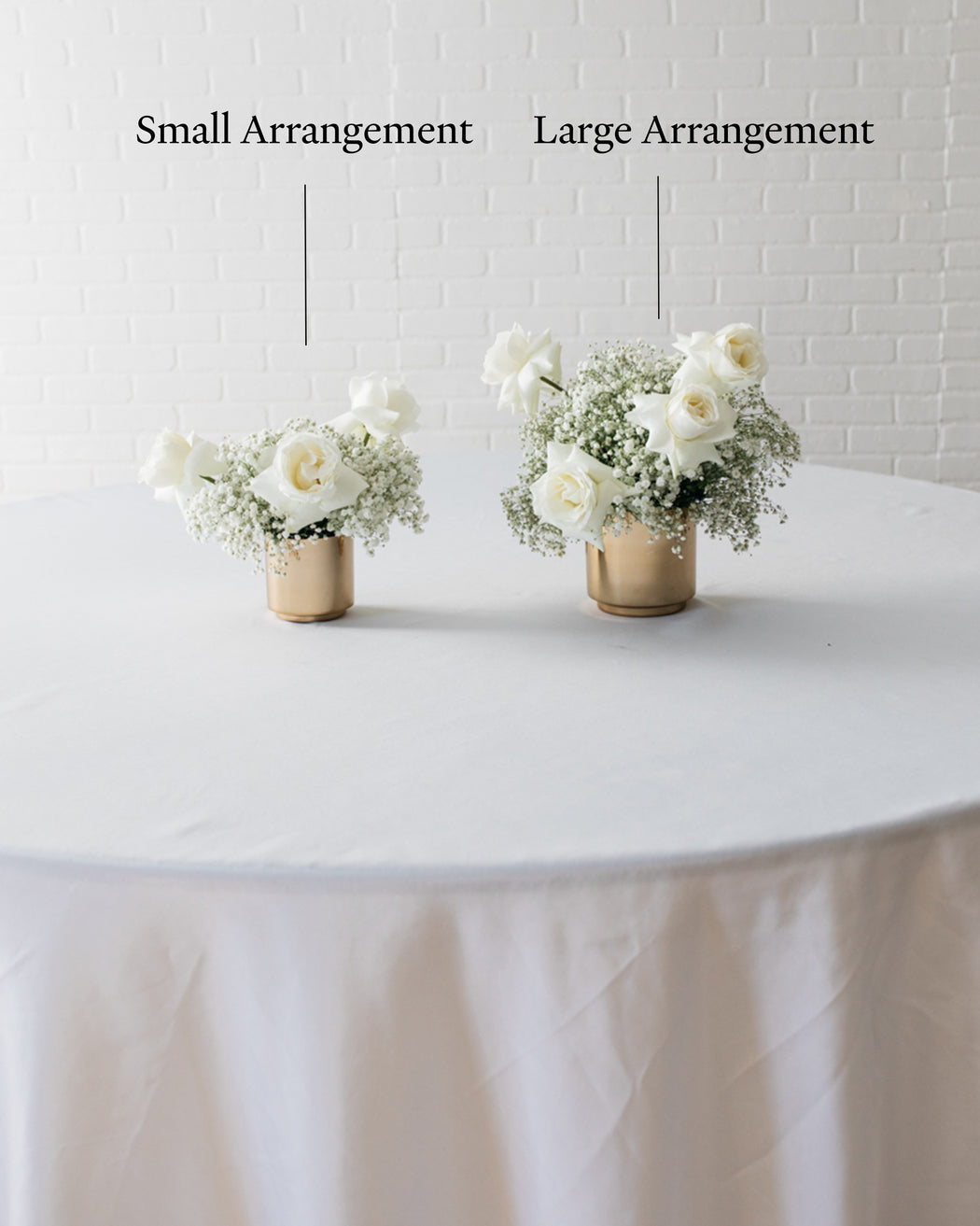 Our minimal small floral arrangement is the ultimate floral arrangement your celebration must have! This gorgeous arrangement includes white roses and white baby's breath and is the perfect arrangement for any table centerpiece. Choose between glass, gold or white vases to match your theme.