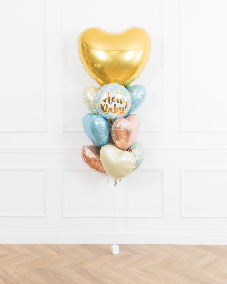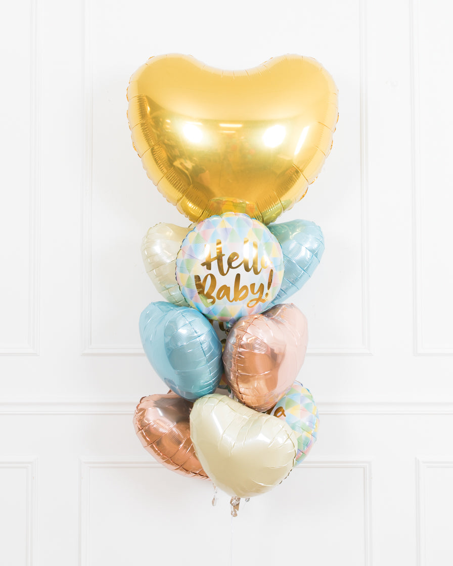 Balloons - ivory heart, pastel blue heart, rose gold heart, hello baby pastel foil