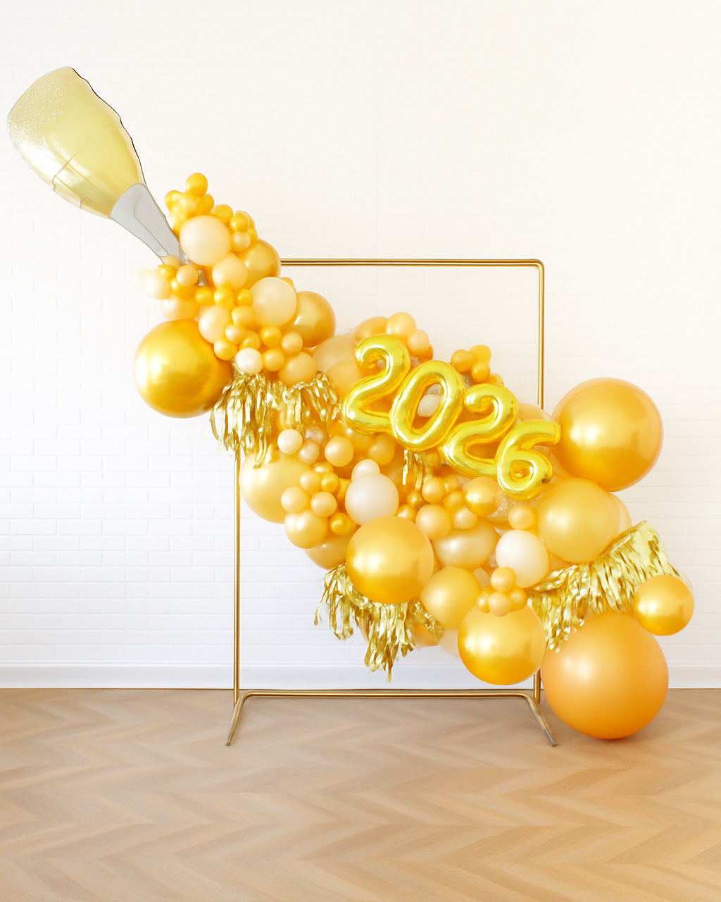 Instantly transform your NYE bash with our small frame and balloon garland design! With fun additional foils and gold accents, your party will have plenty of glitz and glam.