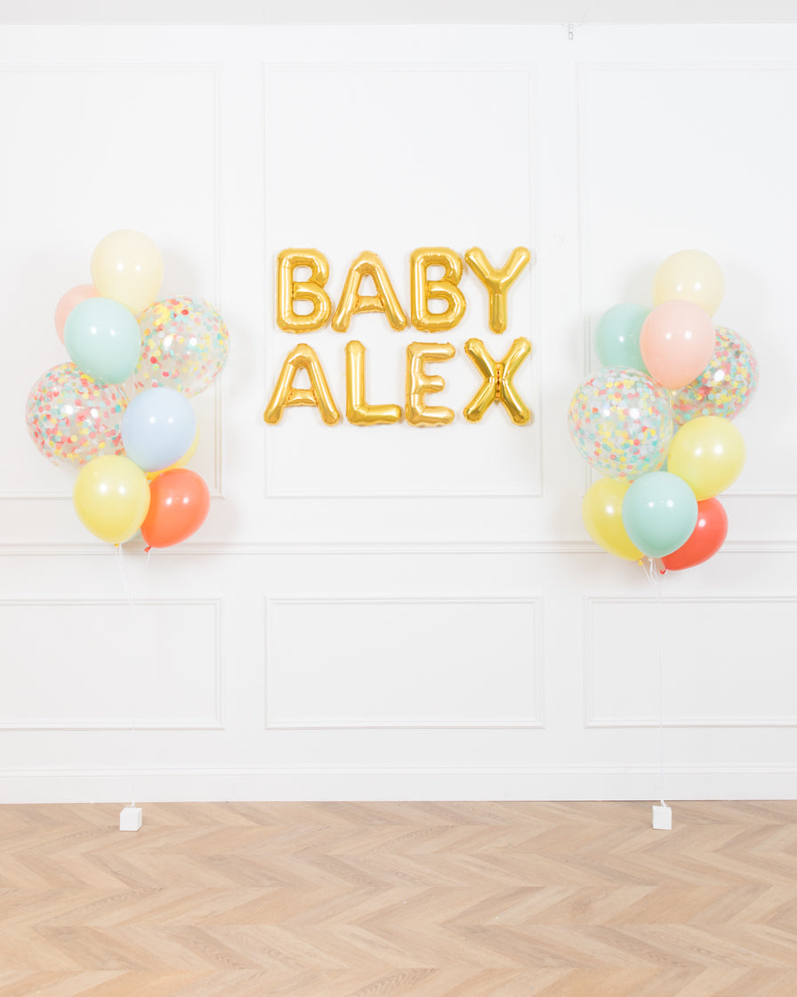 Fill the room with this super sweet balloon set! This includes 2 confetti balloon bouquets and gold letters spelling out baby and the name of your choice to create an easy and festive backdrop for your office or staff baby shower.