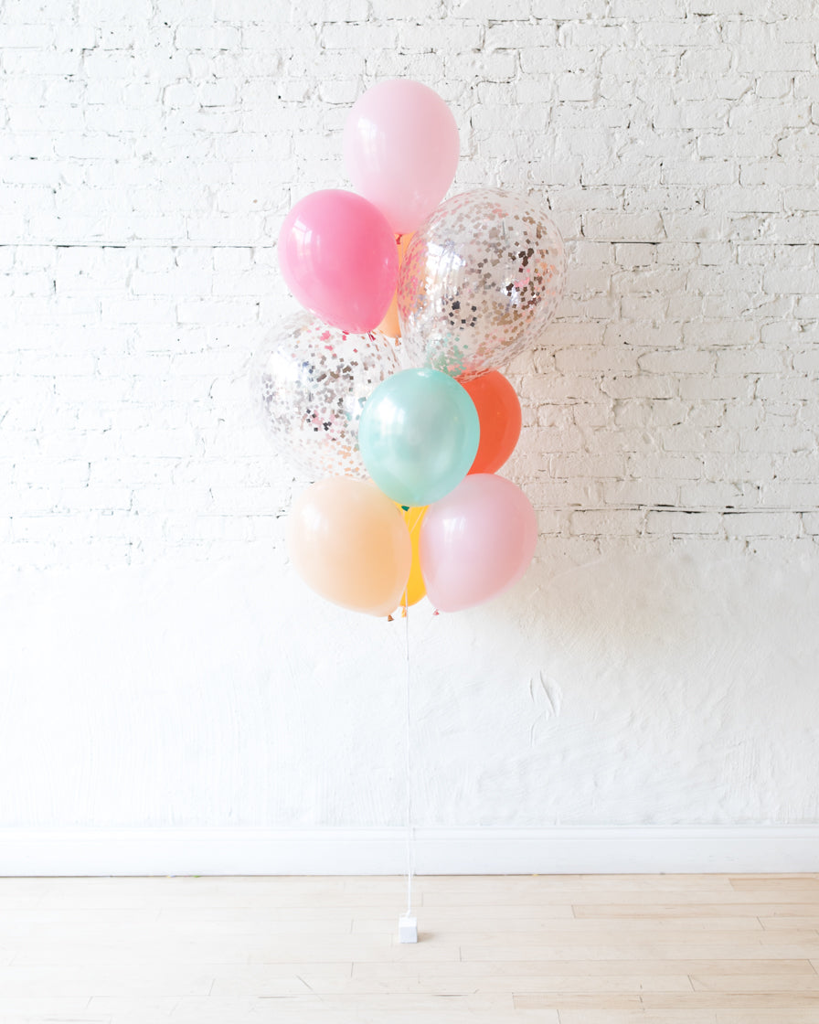 Bring fun and glam to your party with our popular confetti bouquet. This helium-filled balloon bouquet includes bright balloons and matching confetti to add fun to any sweets table or backdrop.