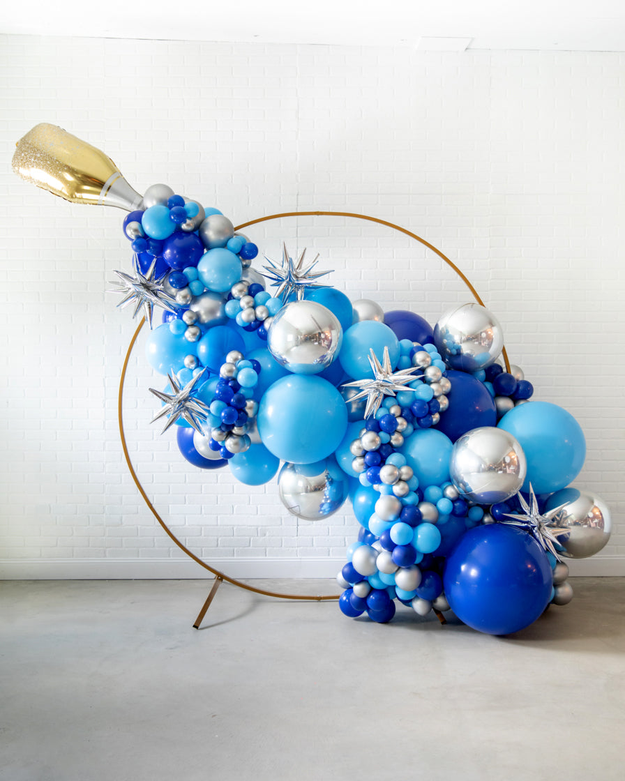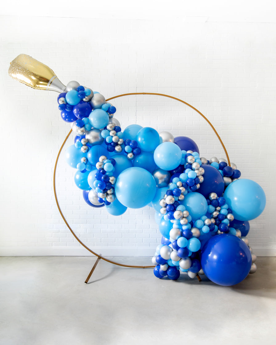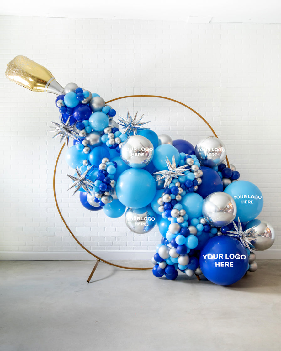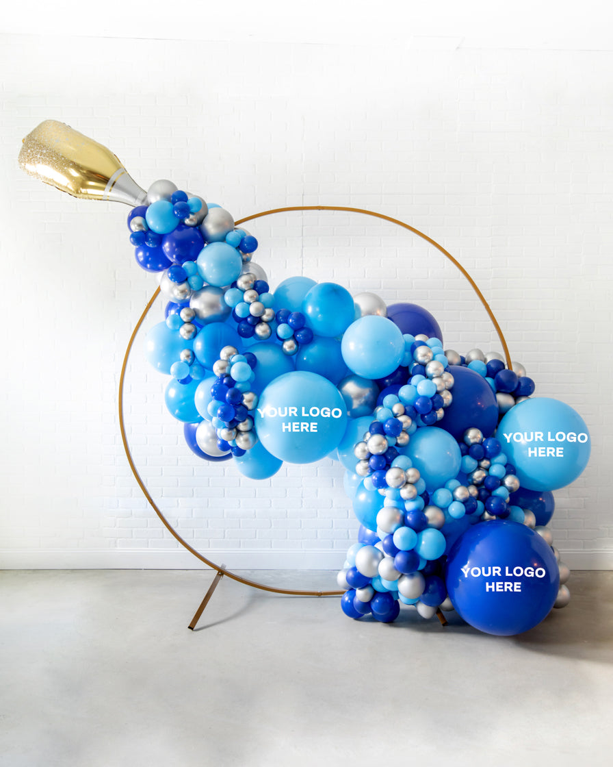 Create a show stopping event with our organic balloon backdrop on gold circle frame. This unique design allows for plenty of photo worthy moments at your corporate celebration. The champagne bottle adds an extra celebratory touch.