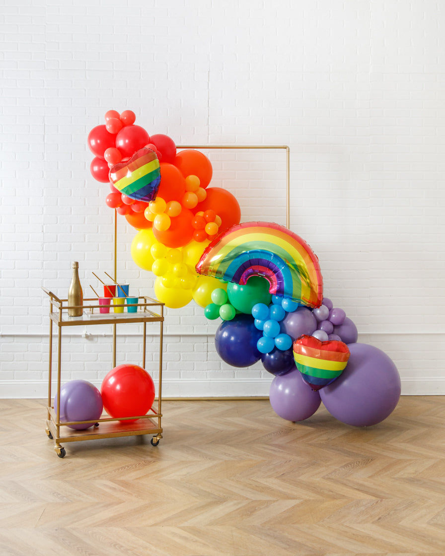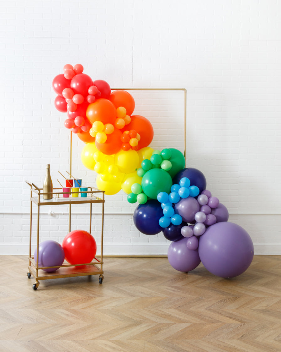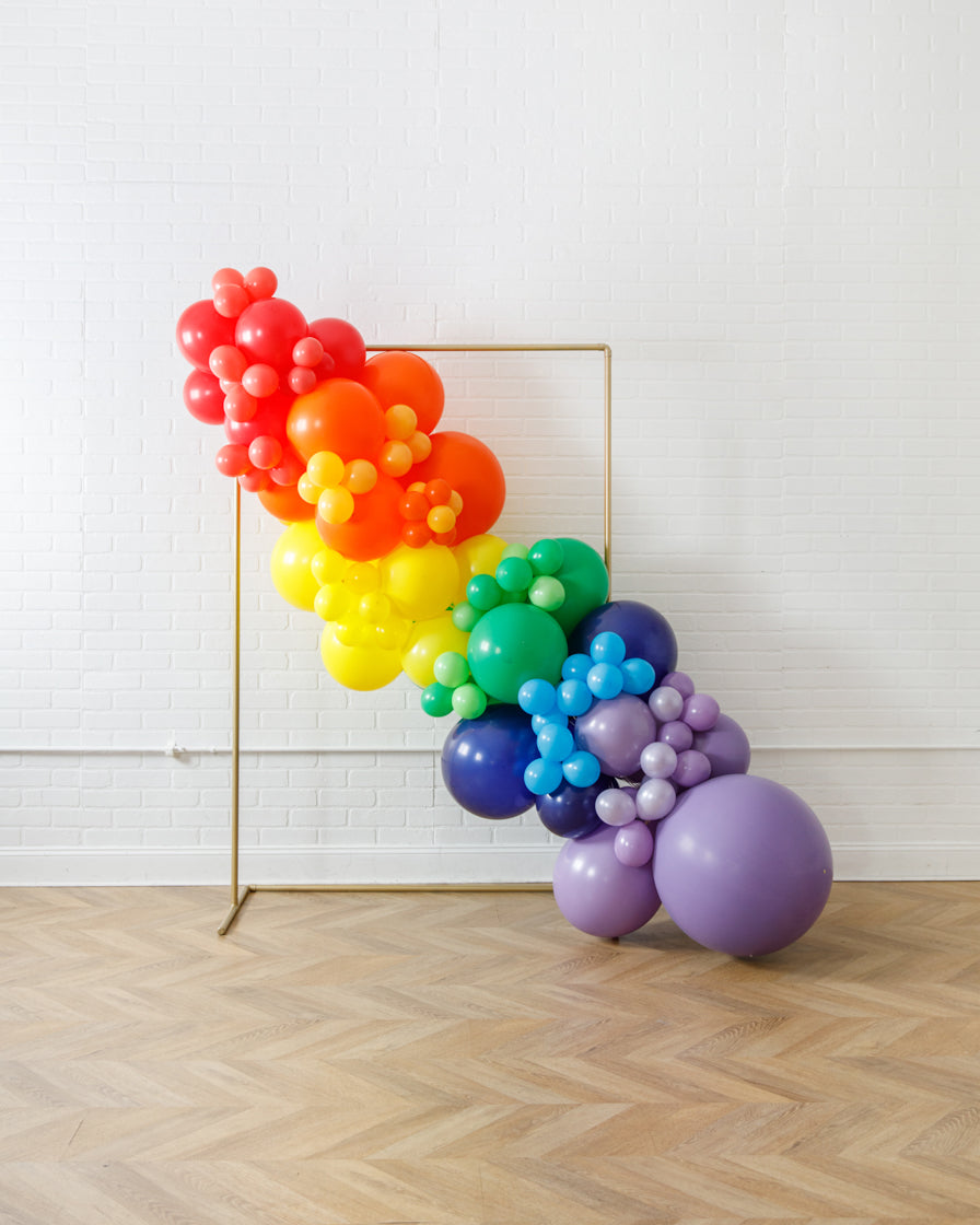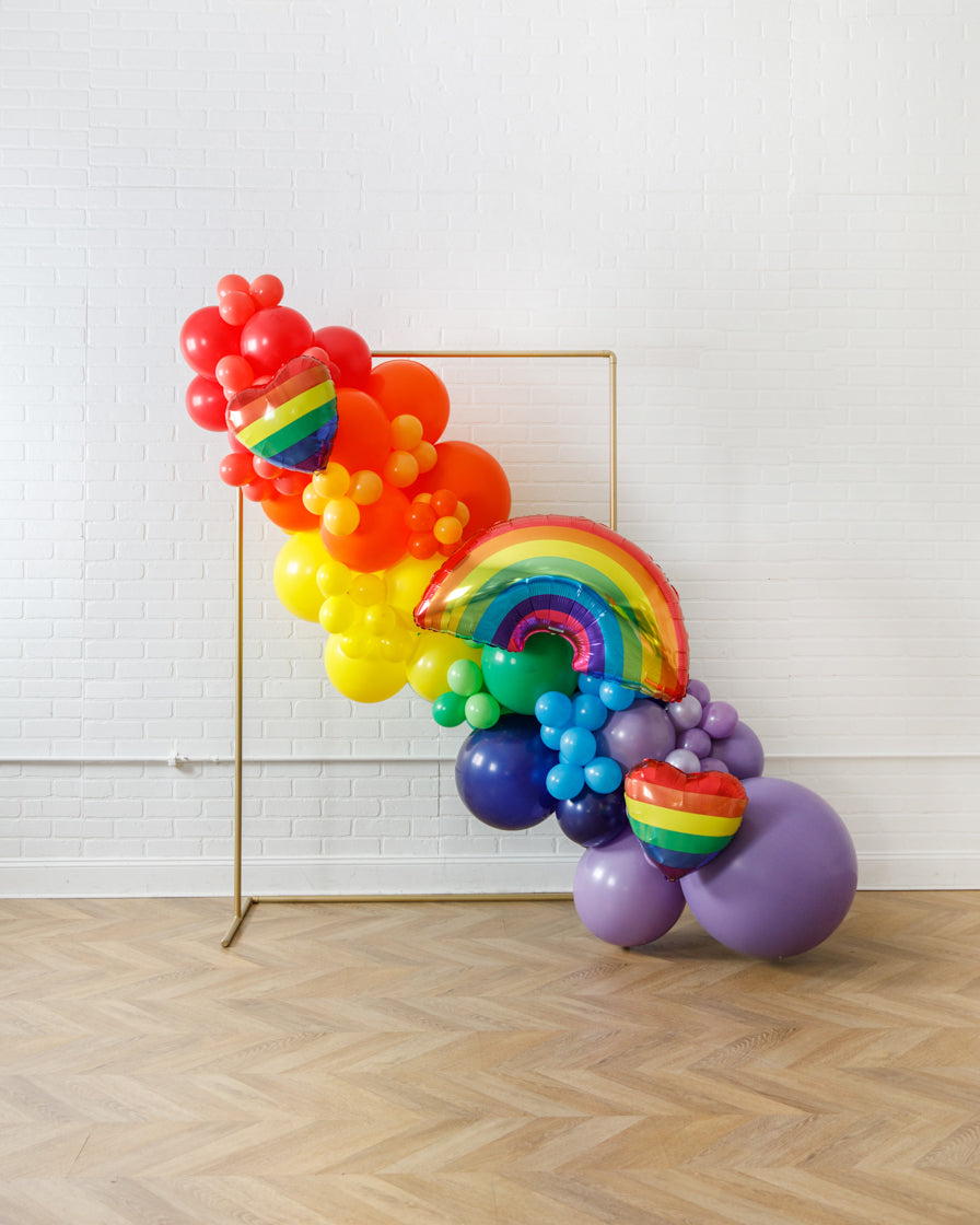 Instantly transform your event with our small frame and balloon garland design! This organic Pride inspired garland drapes around our signature gold frame for a one of a kind look! Bring even love to the event with rainbow foils.