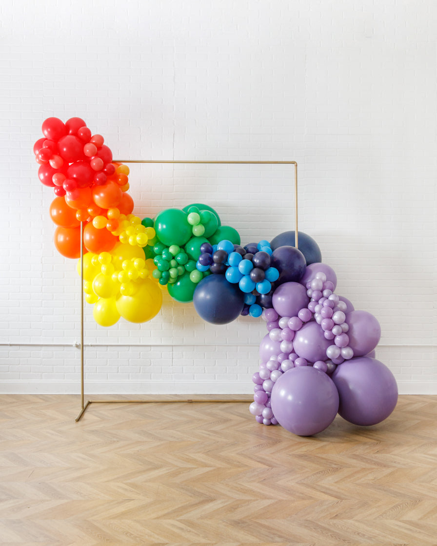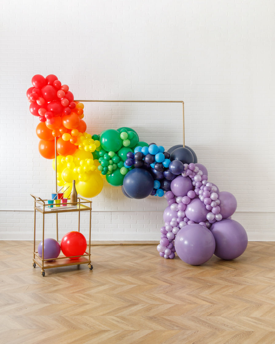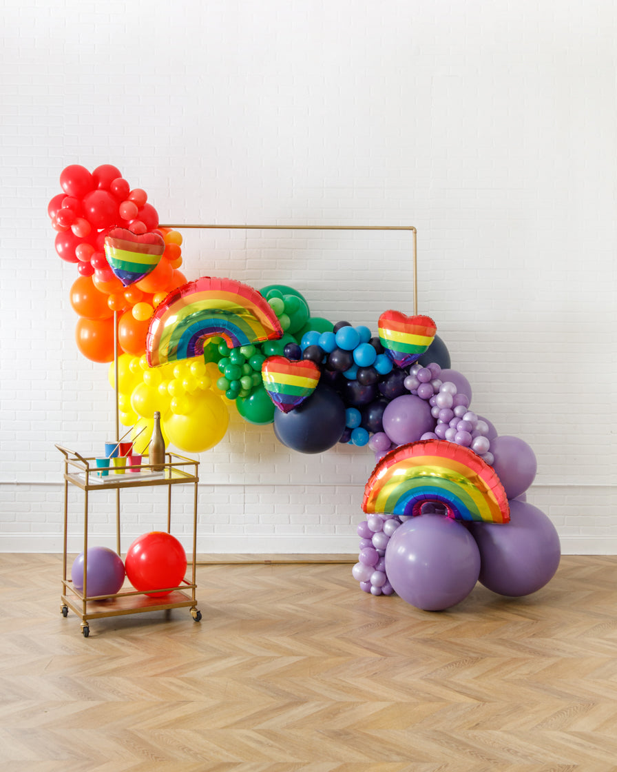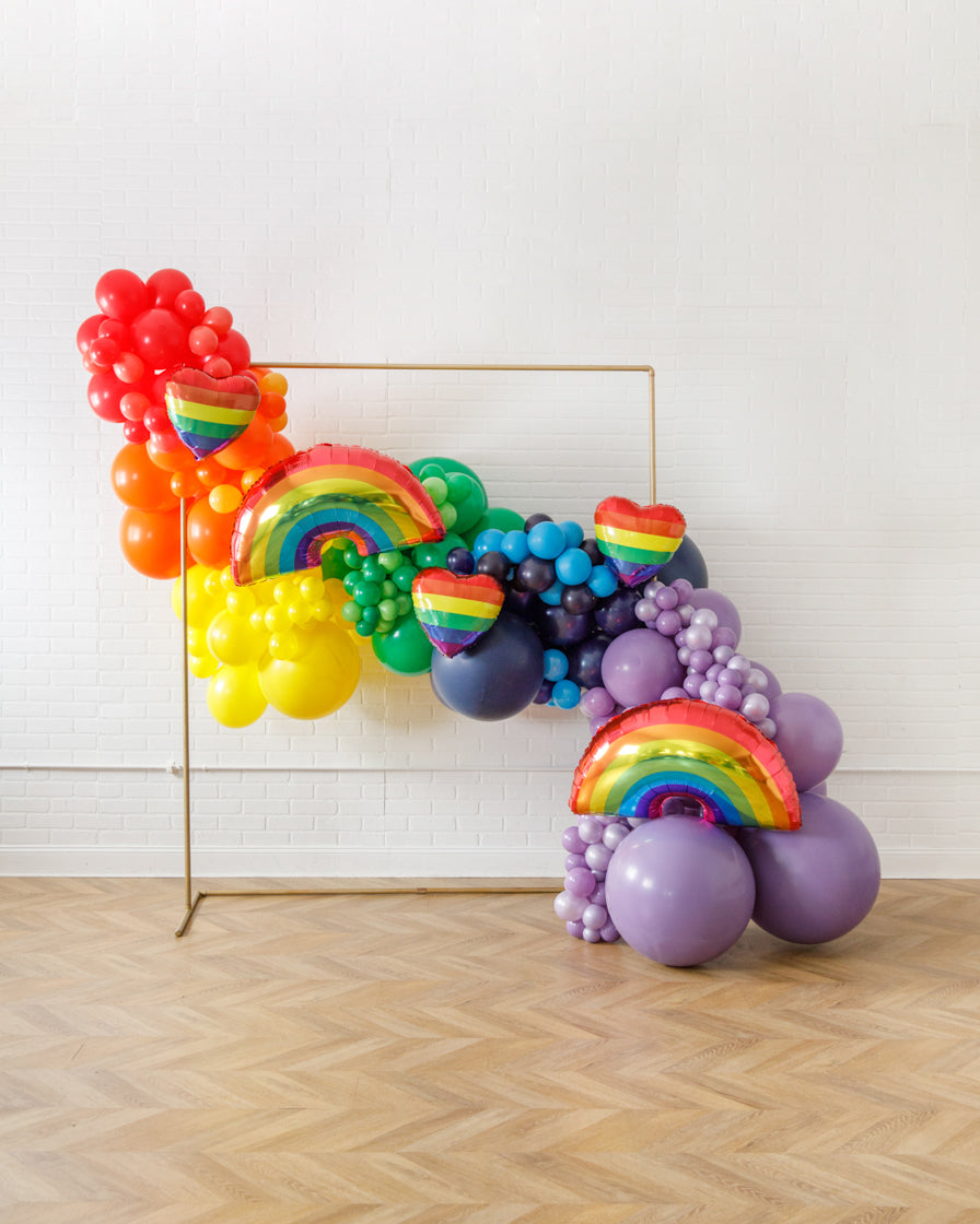 Celebrate Pride boldly with our signature gold frame and diagonal organic garland design! This includes a full balloon garland cascading across the frame, perfect for photos. With added rainbow foils, there's more to love.