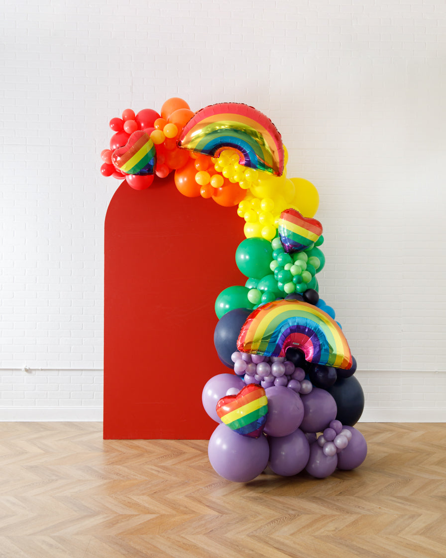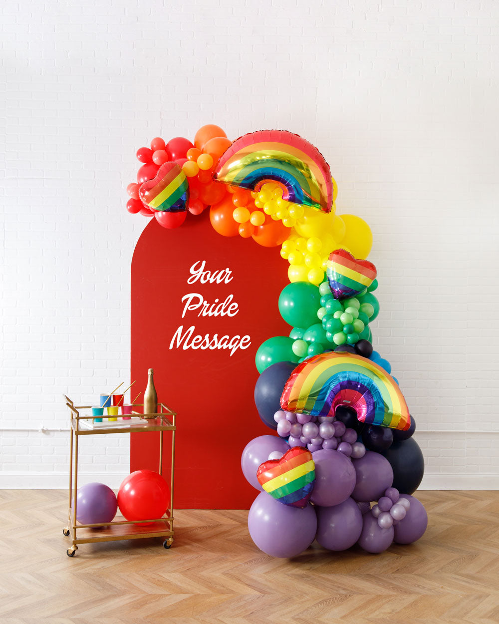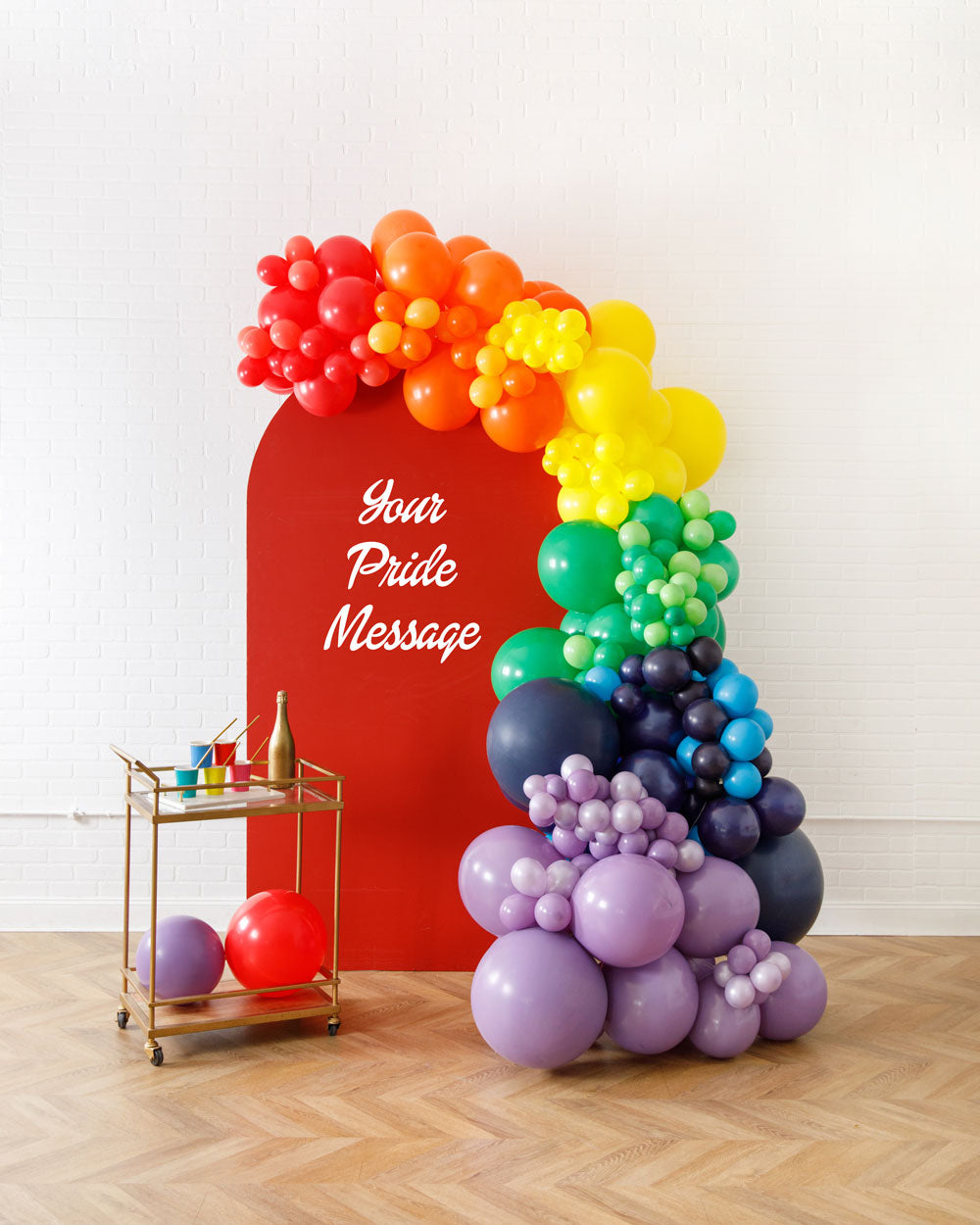 Stand out in style with this panel and rainbow balloon garland design. This includes a 7ft panel backdrop with organic pride inspired balloon garland to match. Added rainbow foil accents make your photo backdrop stand out even more!