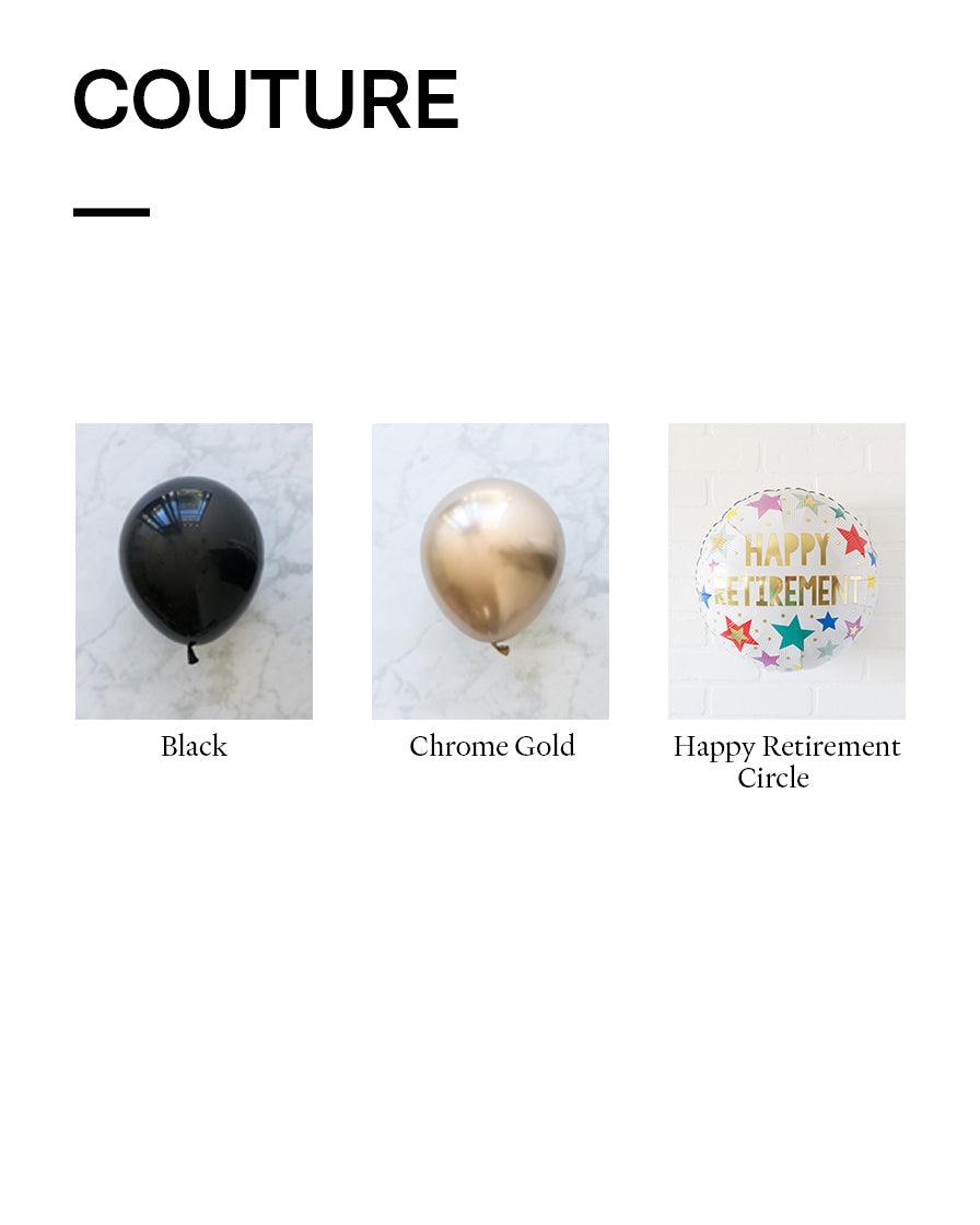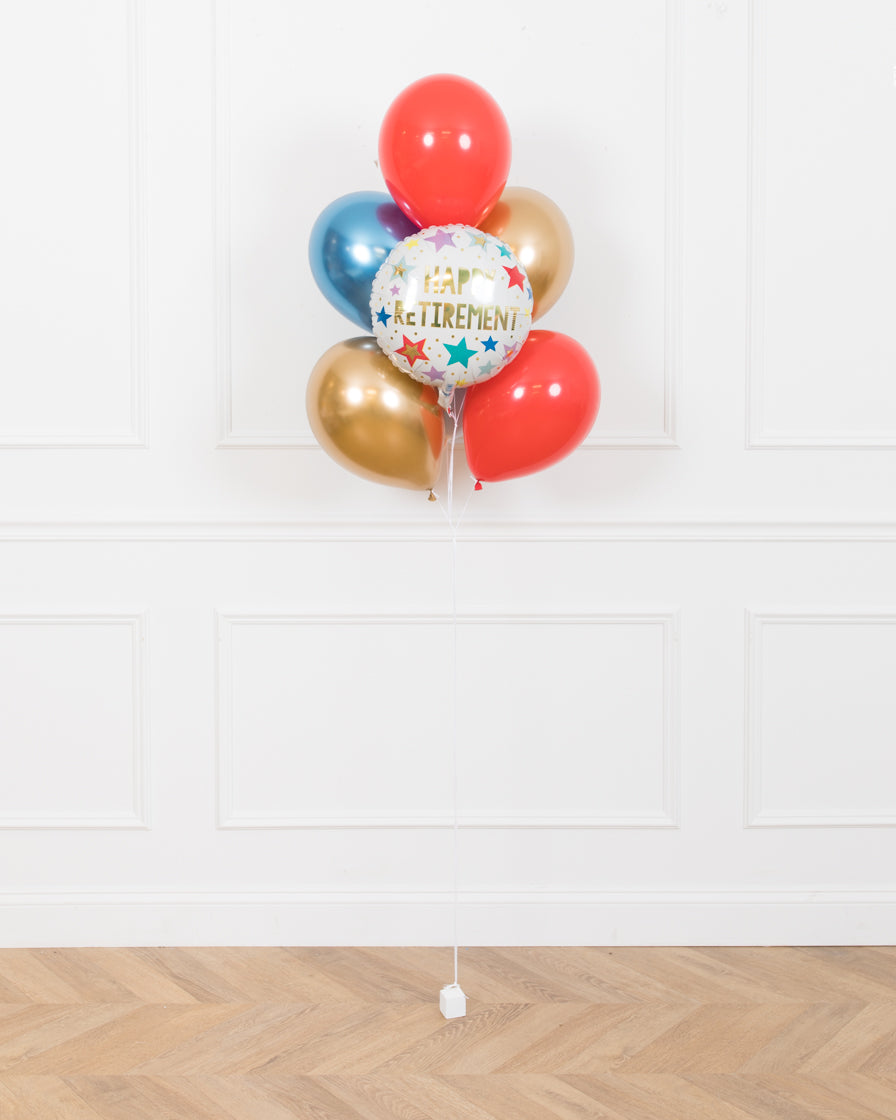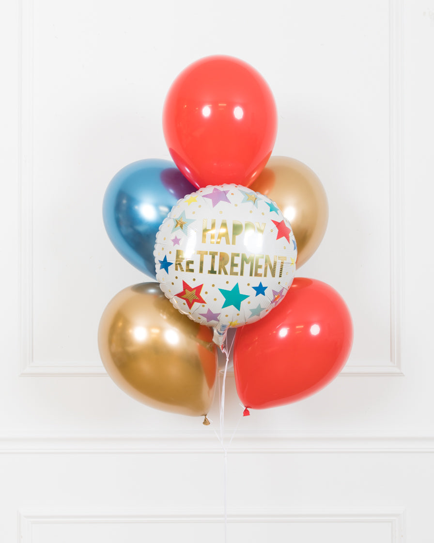 Make an office retirement party memorable with our latex and foil balloon bouquet. This includes bright helium filled balloons and a happy retirement foil balloon for added fun. Make an impact in any office space!