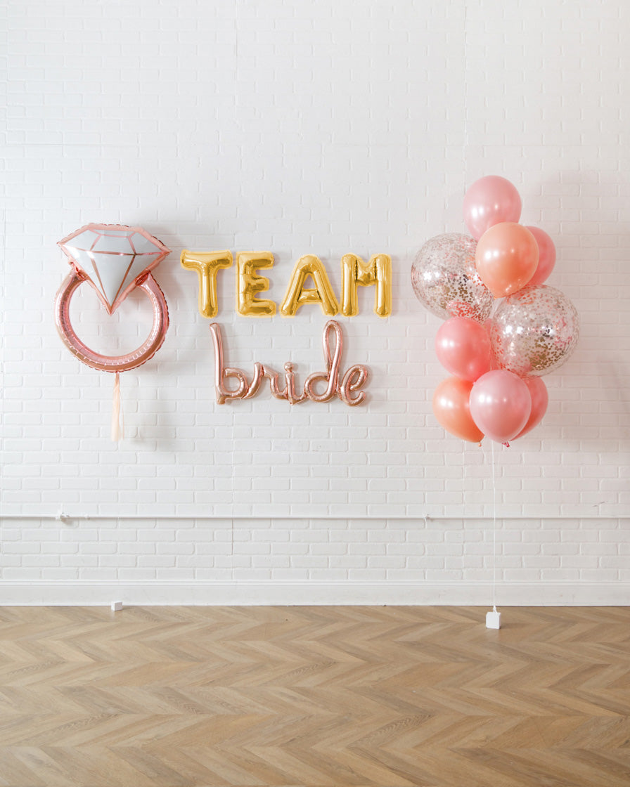Show her you're on Team Bride with this fun and festive balloon set. This includes Team Bride Balloon letters, a ring balloon with skirt and a colorful confetti bouquet.