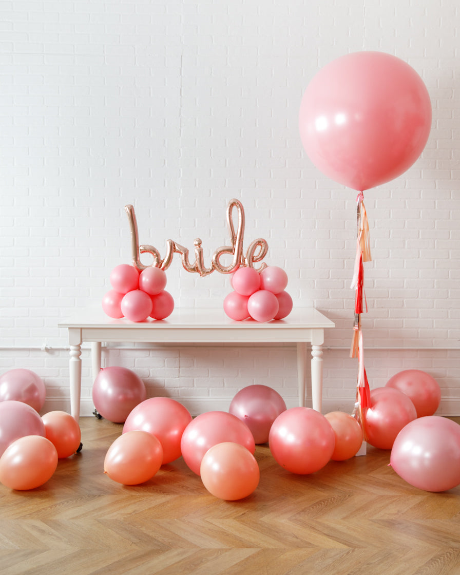 Make the bride to be's bachelorette bold and stylish! This set includes a bride table top, floor balloons and a giant balloon with tassel for a festive bash! This set is Ready-To-Party™. Comes inflated and assembled. Simply unbag and enjoy.