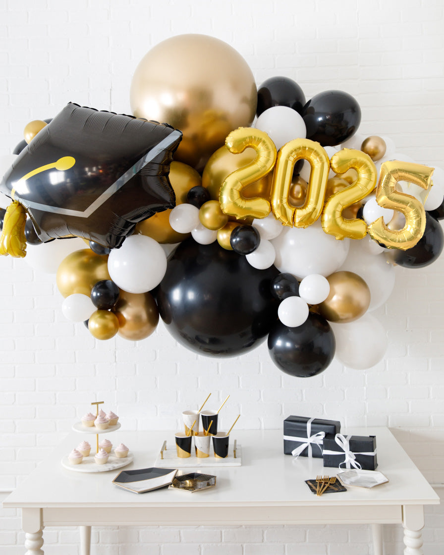 Celebrate a milestone with this eye-catching balloon garland. This piece can be installed above a sweets table or on a wall for a photo op. Complete the look with giant balloons or balloon columns from this same collection.