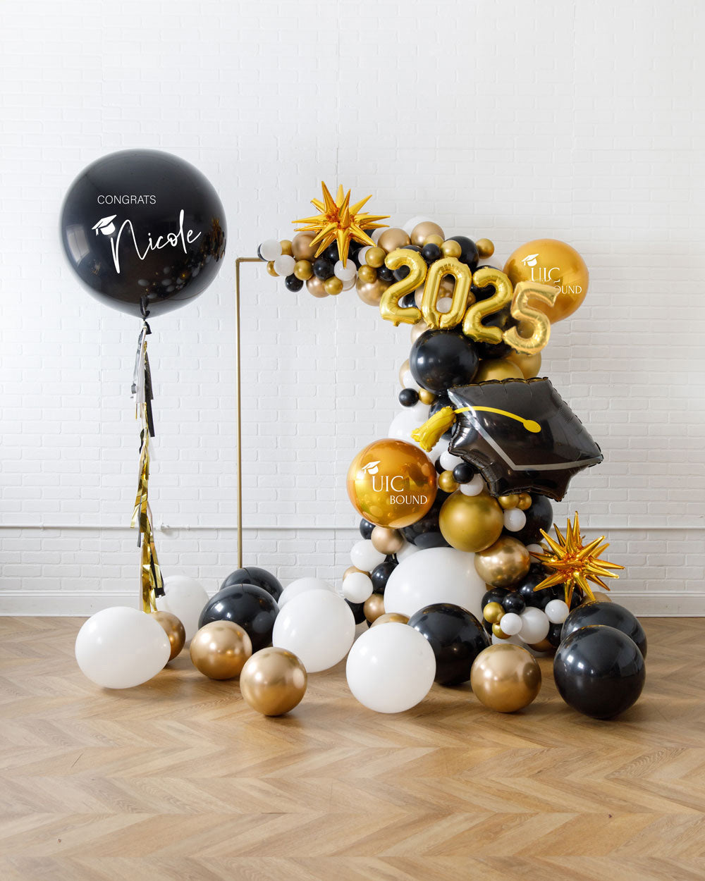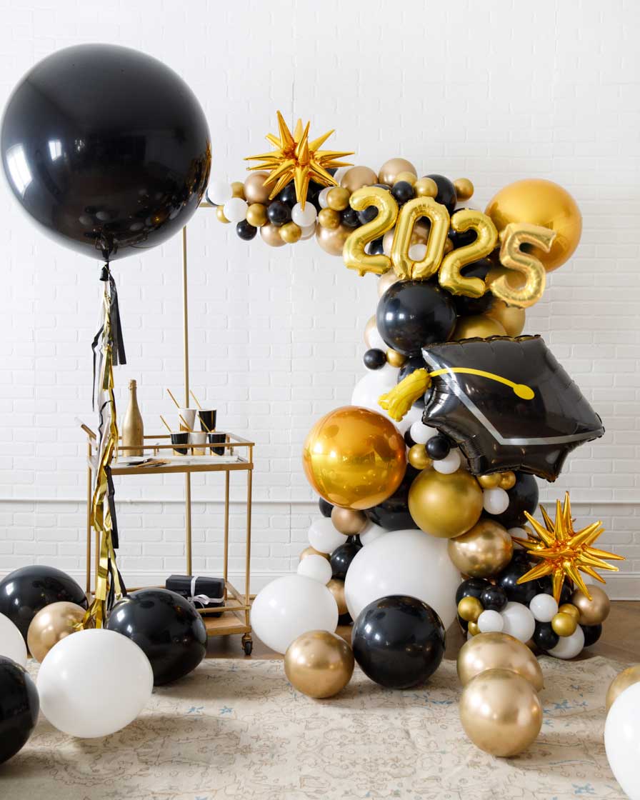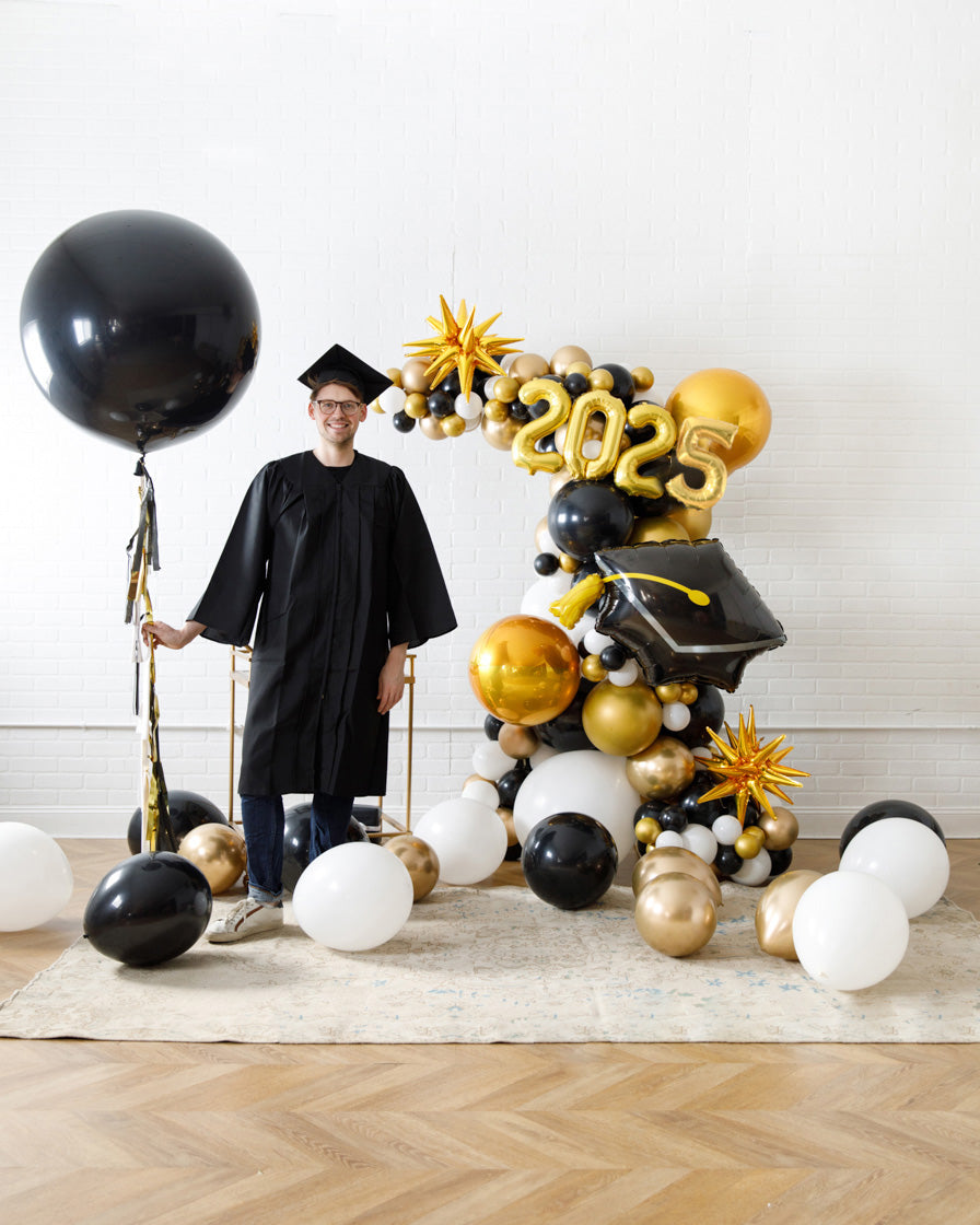 Make any space into a celebration with this balloon set, perfect for a graduation! This festive decor set includes a garland on our signature frame, giant balloon and floor balloons. They can easily celebrate their graduation in style!
