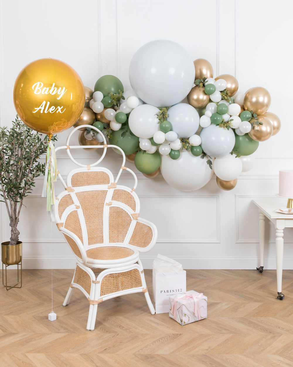Fill your space with our botanical themed balloon set. This includes a 6ft balloon garland with greenery and white and gold accents, as well as a gold orb balloon. Add this to your space for a one of kind shower.