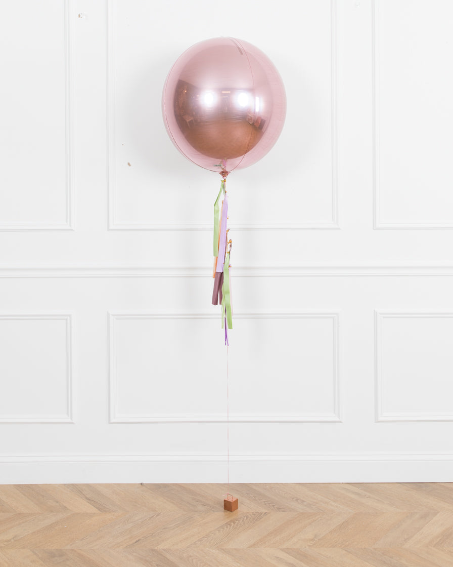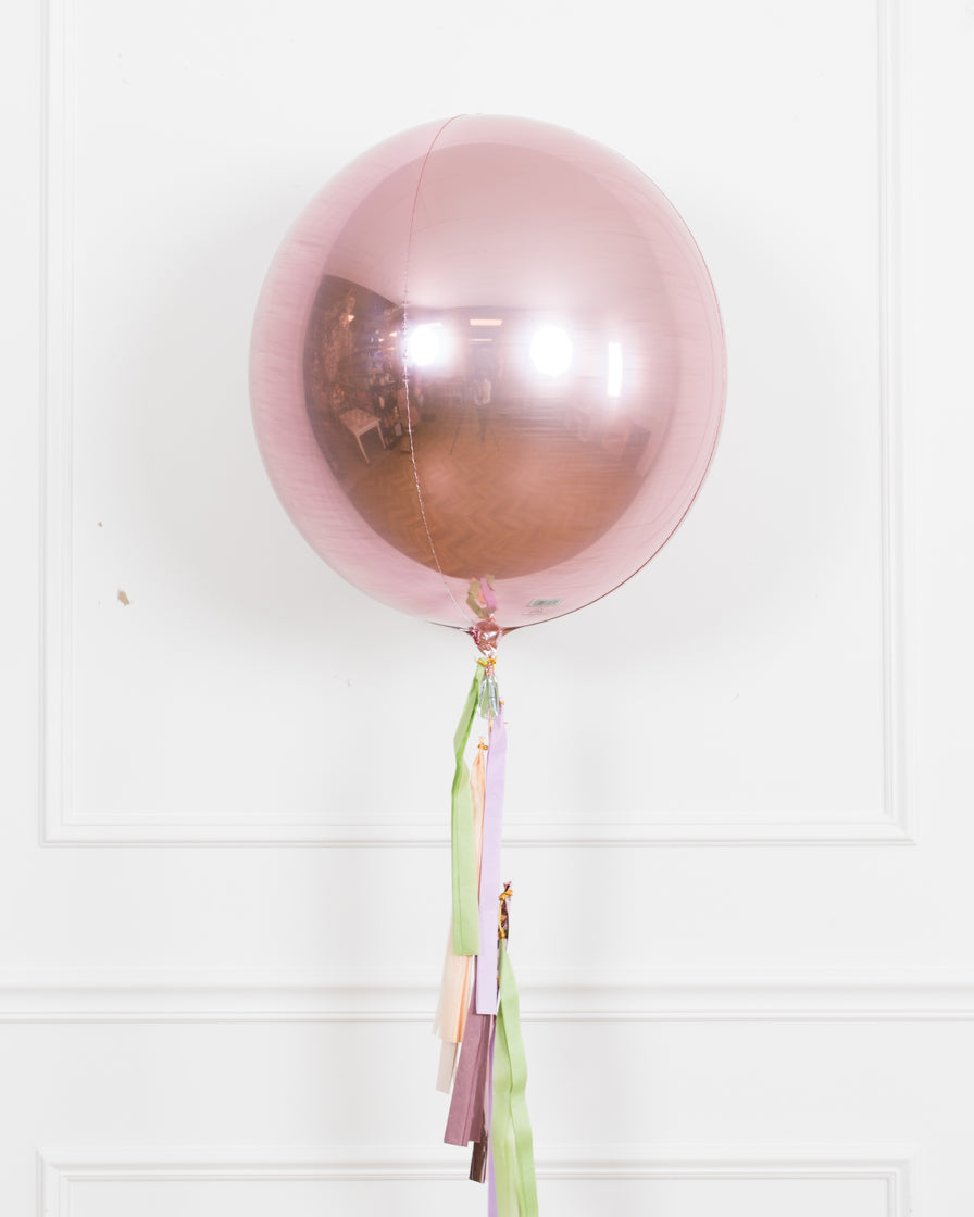 An elegant option that always makes an impression. This helium-filled rose gold orb balloon with tassel garland is an easy way to decorate a shower.