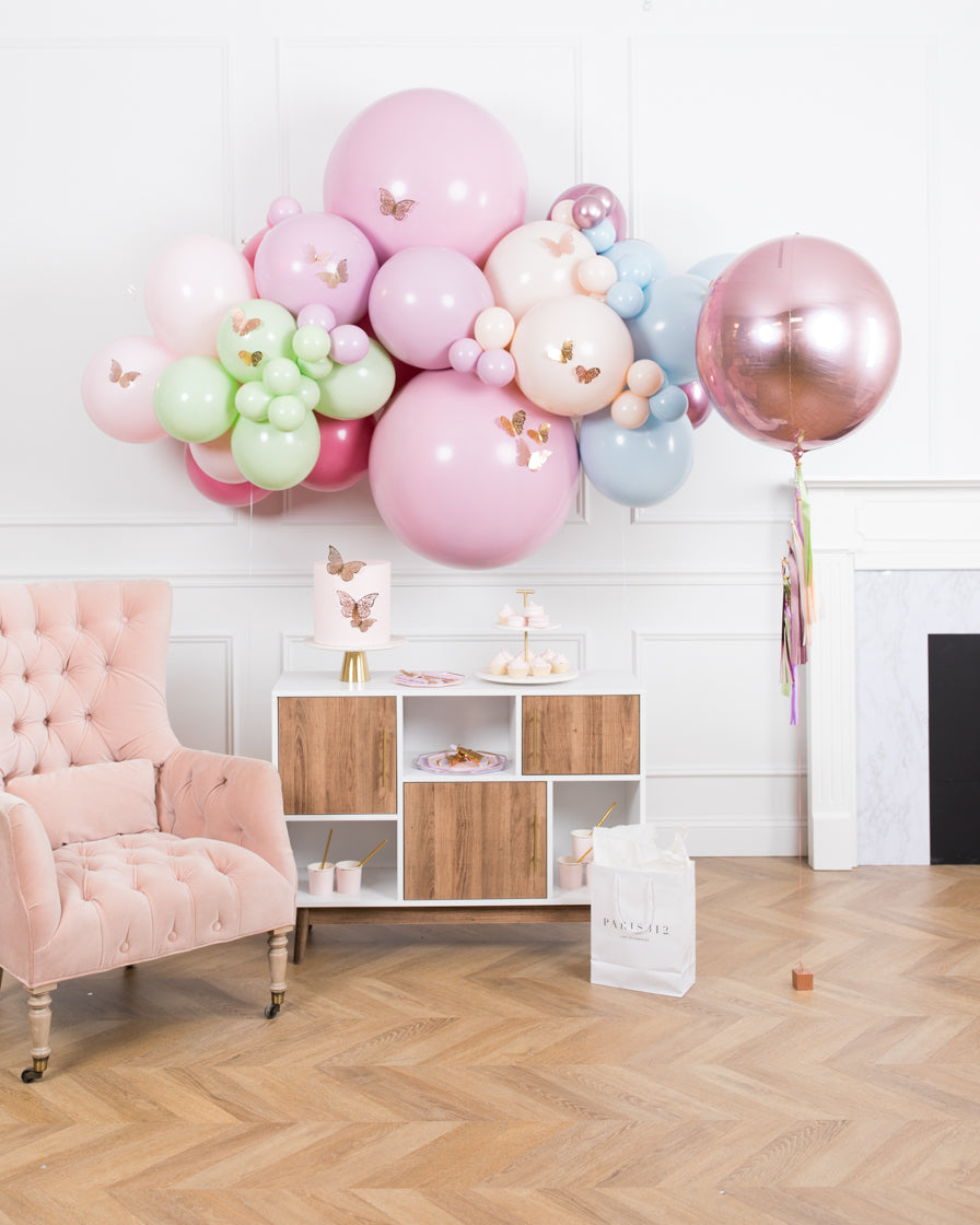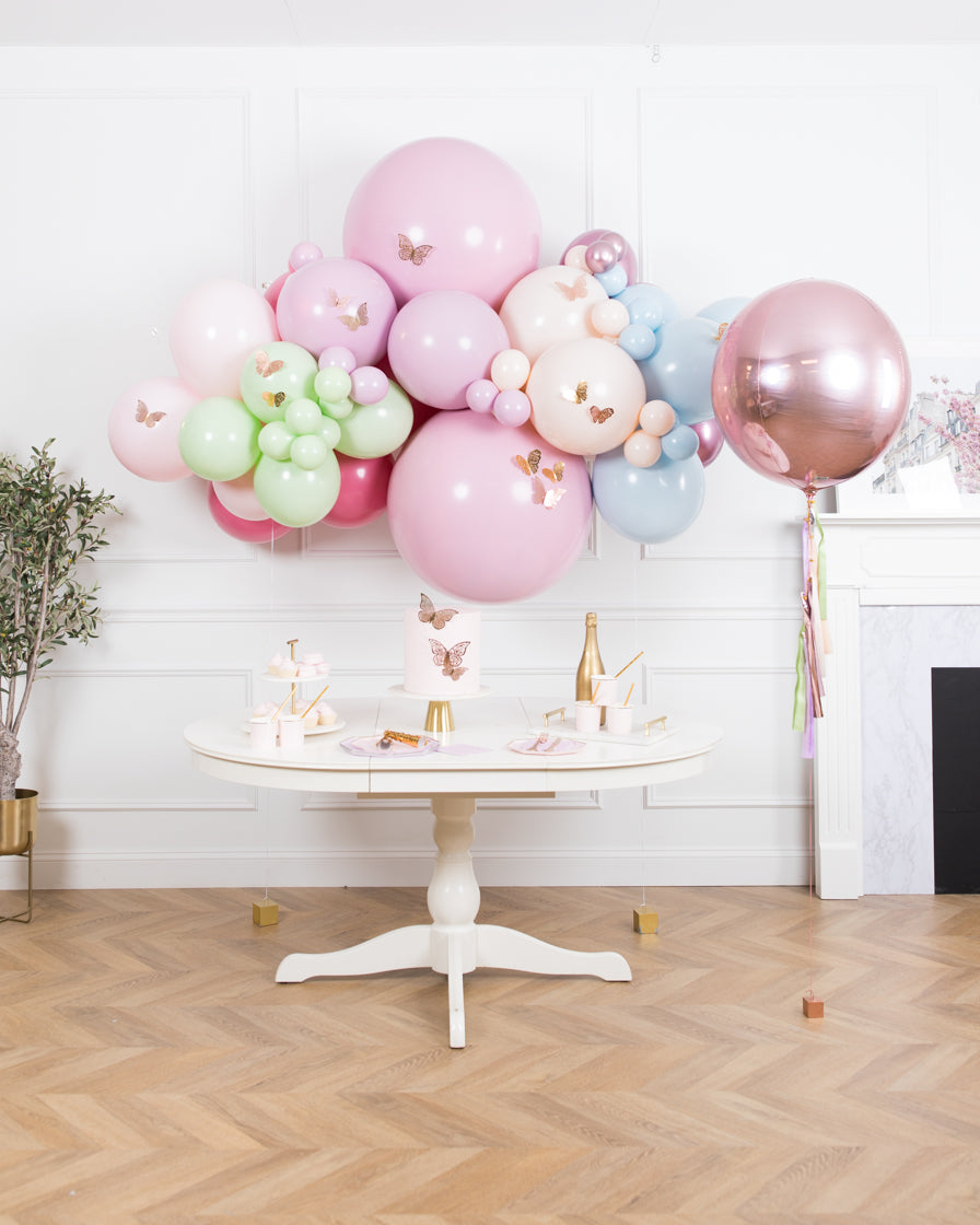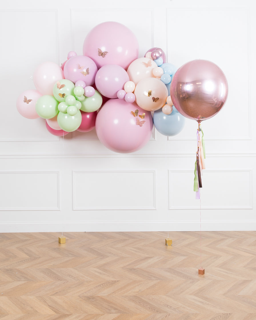 Create a beautiful celebration with this fun butterfly garden themed set. This includes a 6ft floating balloon garland and rose gold orb balloon. Installation not required so you can create an instant party anywhere.