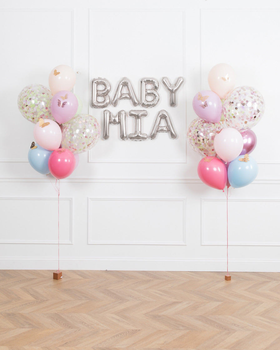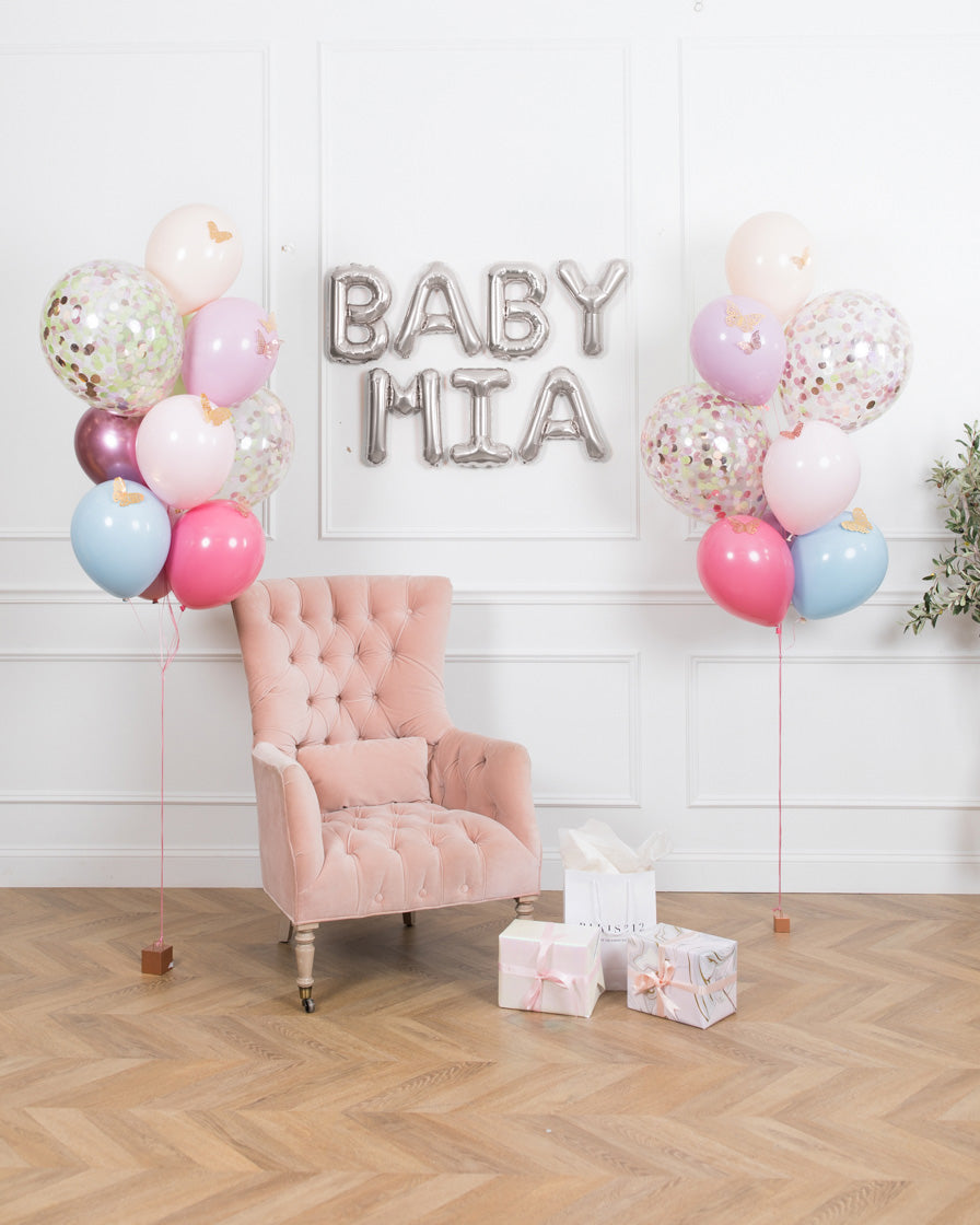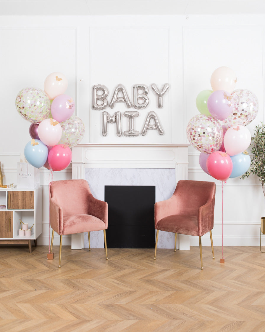 Fill the room with this super sweet balloon set! This includes 2 confetti balloon bouquets and rose gold letters spelling out BABY and the name of your choice to create an easy and festive backdrop.