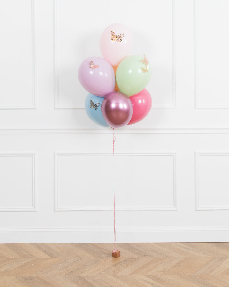 Create an adorable birthday with a classic balloon bouquet. This helium-filled bouquet includes 5 or 7 pastel pink, mauve, sage and blue balloons for a butterfly-themed bash!