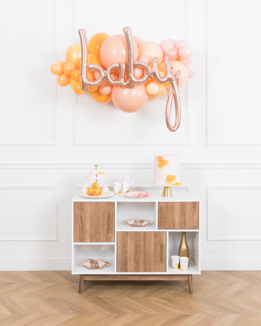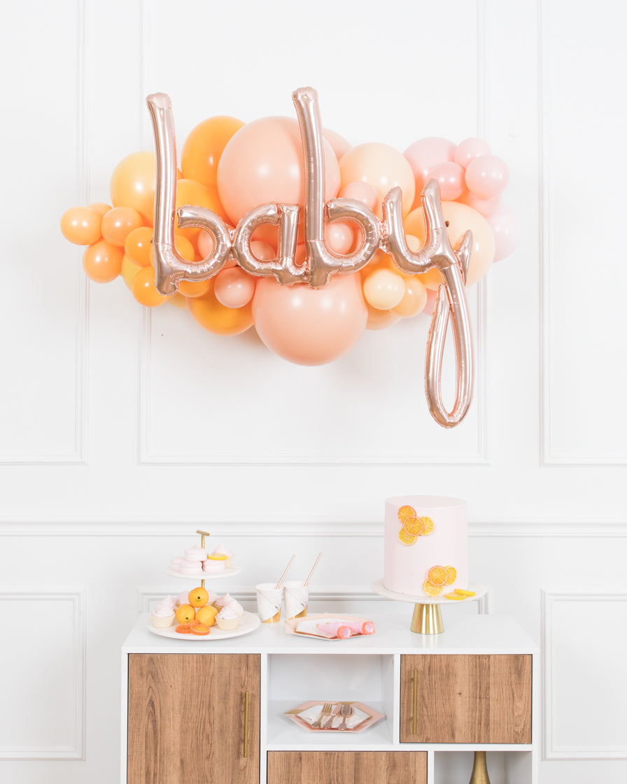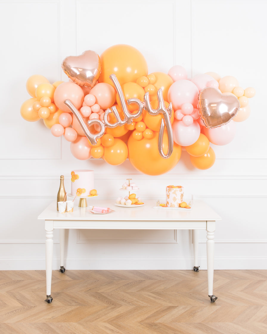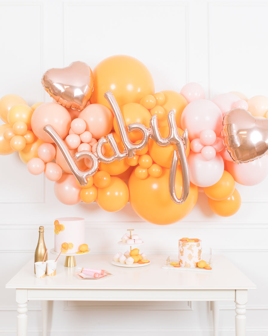 Bring some zest to your baby shower with this 6ft balloon garland. This gorgeous piece is dressed with cute heart foils and a baby script and can be installed above a sweets table or on a wall for a photo op. Complete the look with giant balloons or balloon columns from this citrus collection.